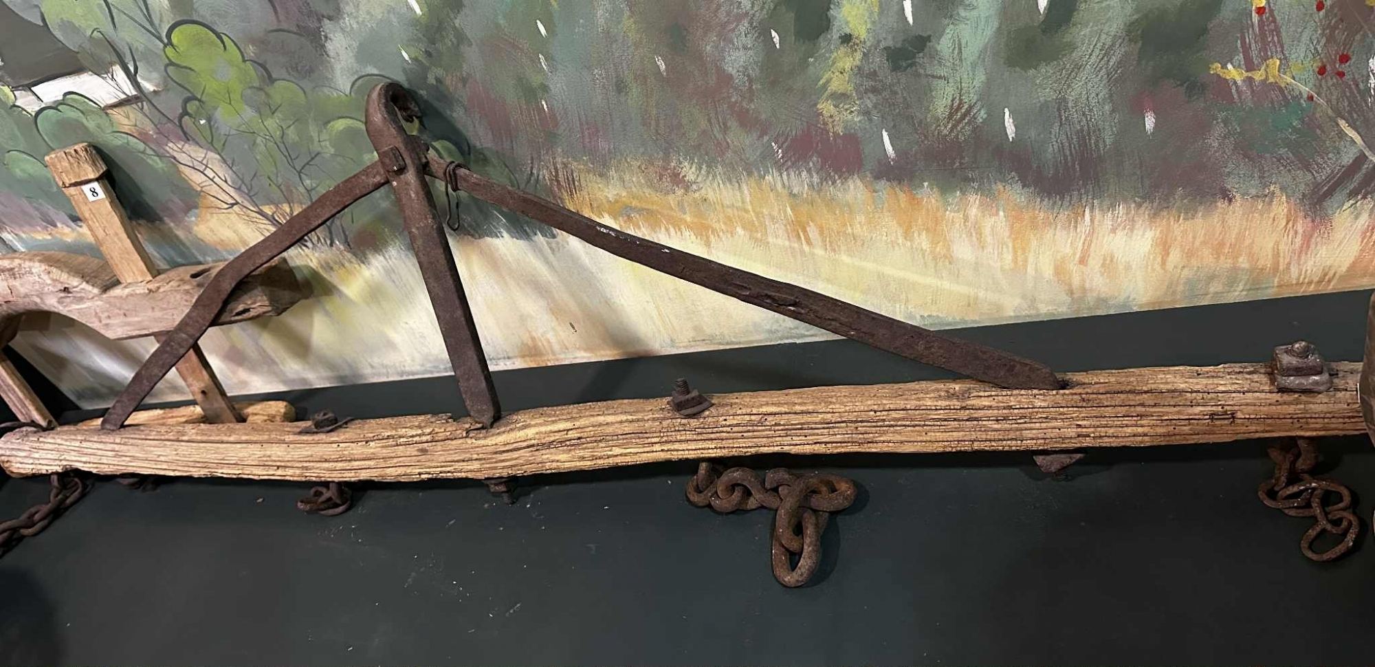 Bară lungă de lemn, întărită cu elemente metalice și lanțuri. În partea superioară prezintă tije de fier fixate în formă triunghiulară, utilizate pentru echilibrarea și susținerea forței de tracțiune. Pe partea inferioară sunt atașate lanțuri masive care se conectau la uneltele agricole (plug, grapă) sau la vehiculul de transport. Servind ca element al jugului, obiectul era folosit la înjugarea boilor sau cailor, permițînd atașarea uneltelor de tracțiune pentru lucrările agricole.