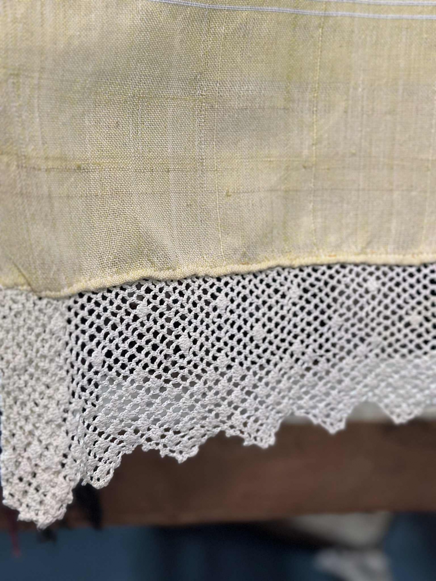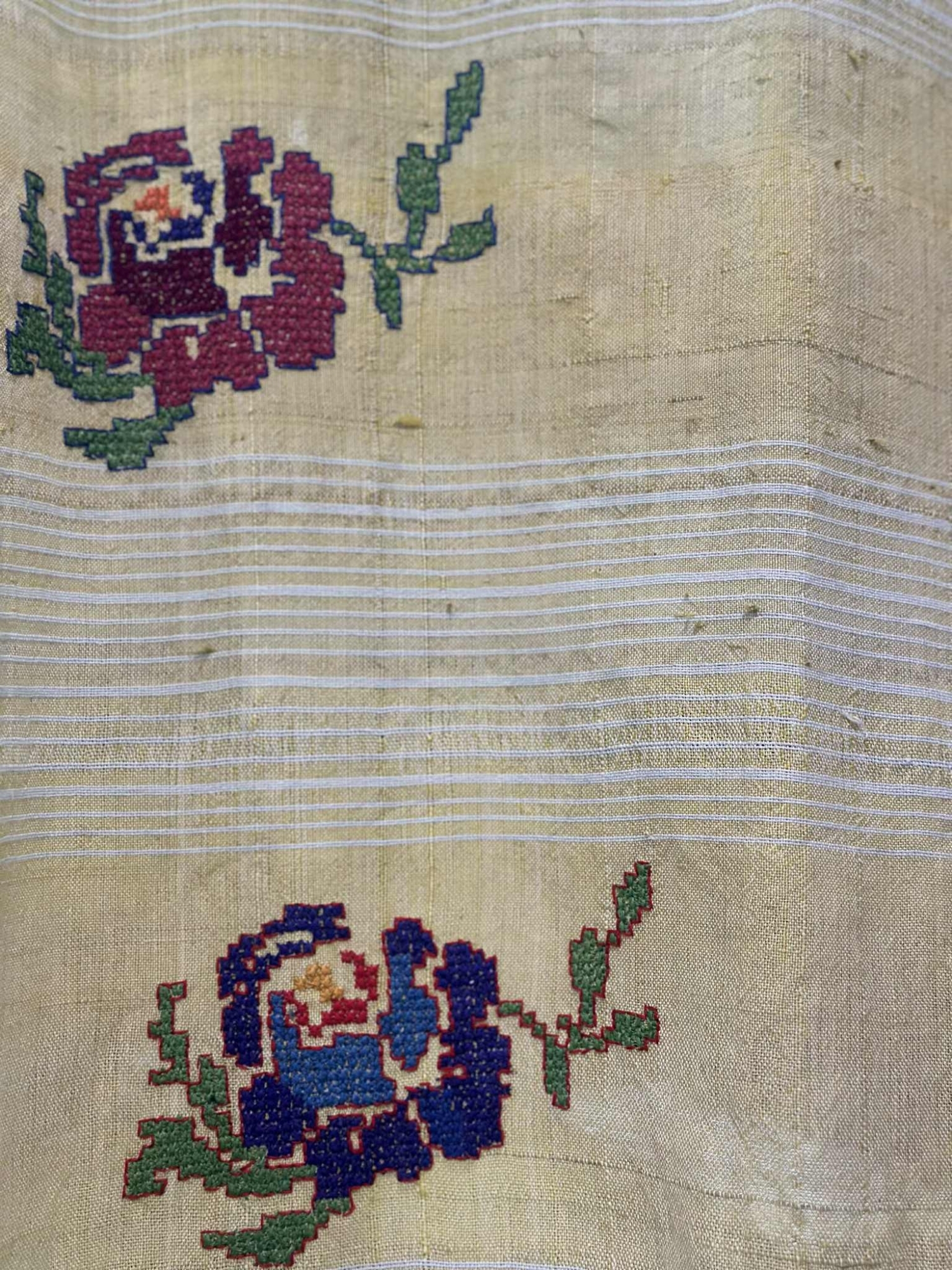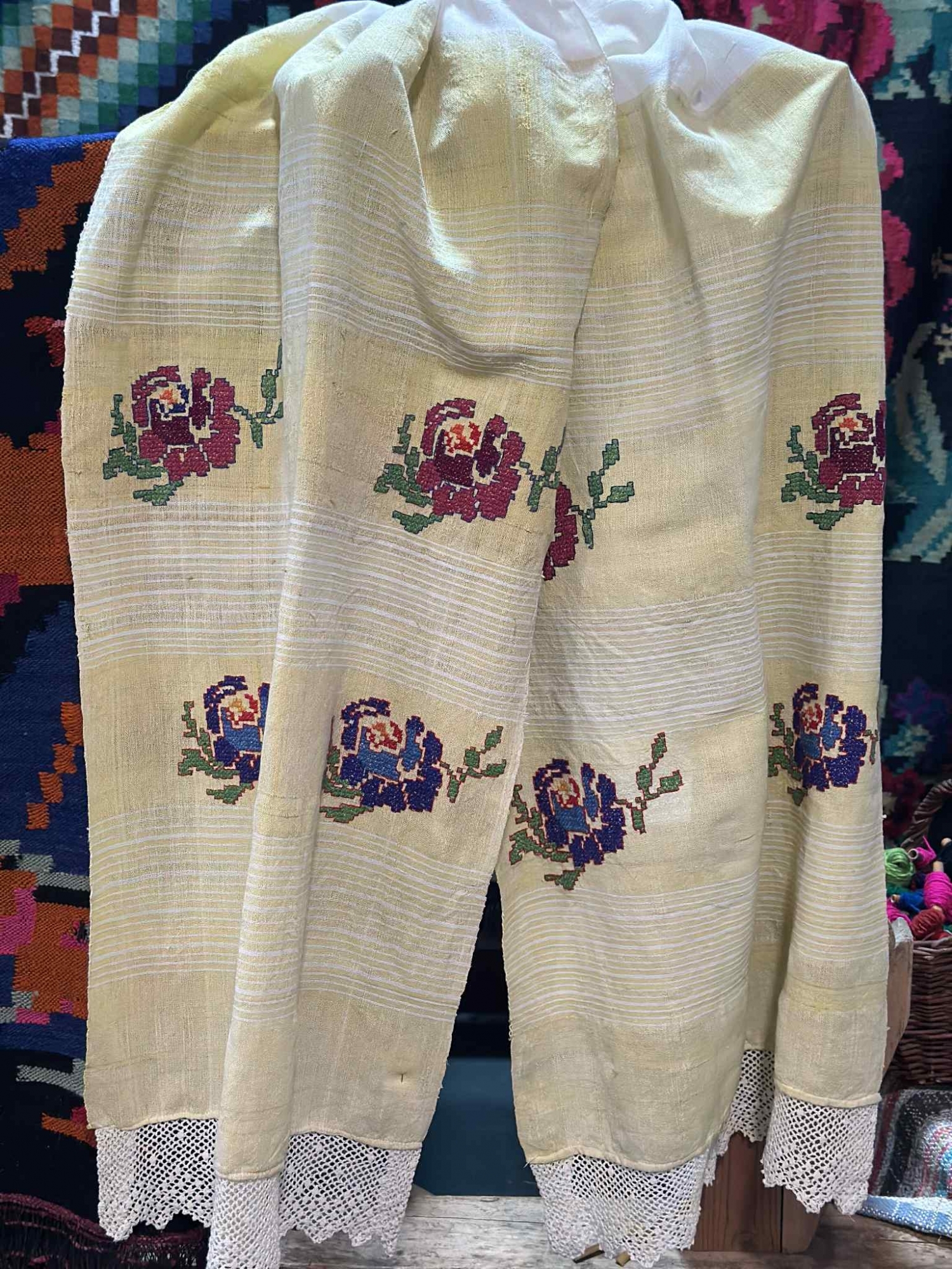Prosop tradițional confecționat din pânză de bumbac țesută manual, de culoare galbenă cu linii orizontale de culoare albă. Țesătura este decorată cu trandafiri brodați manual în două registre, în nuanțe de roșu-bordo și albastru, dispuse pe registre orizontale, la ambele capete ale piesei. Marginea inferioară este ornamentată cu dantelă croșetată manual din fir alb, adăugând un accent decorativ delicat.