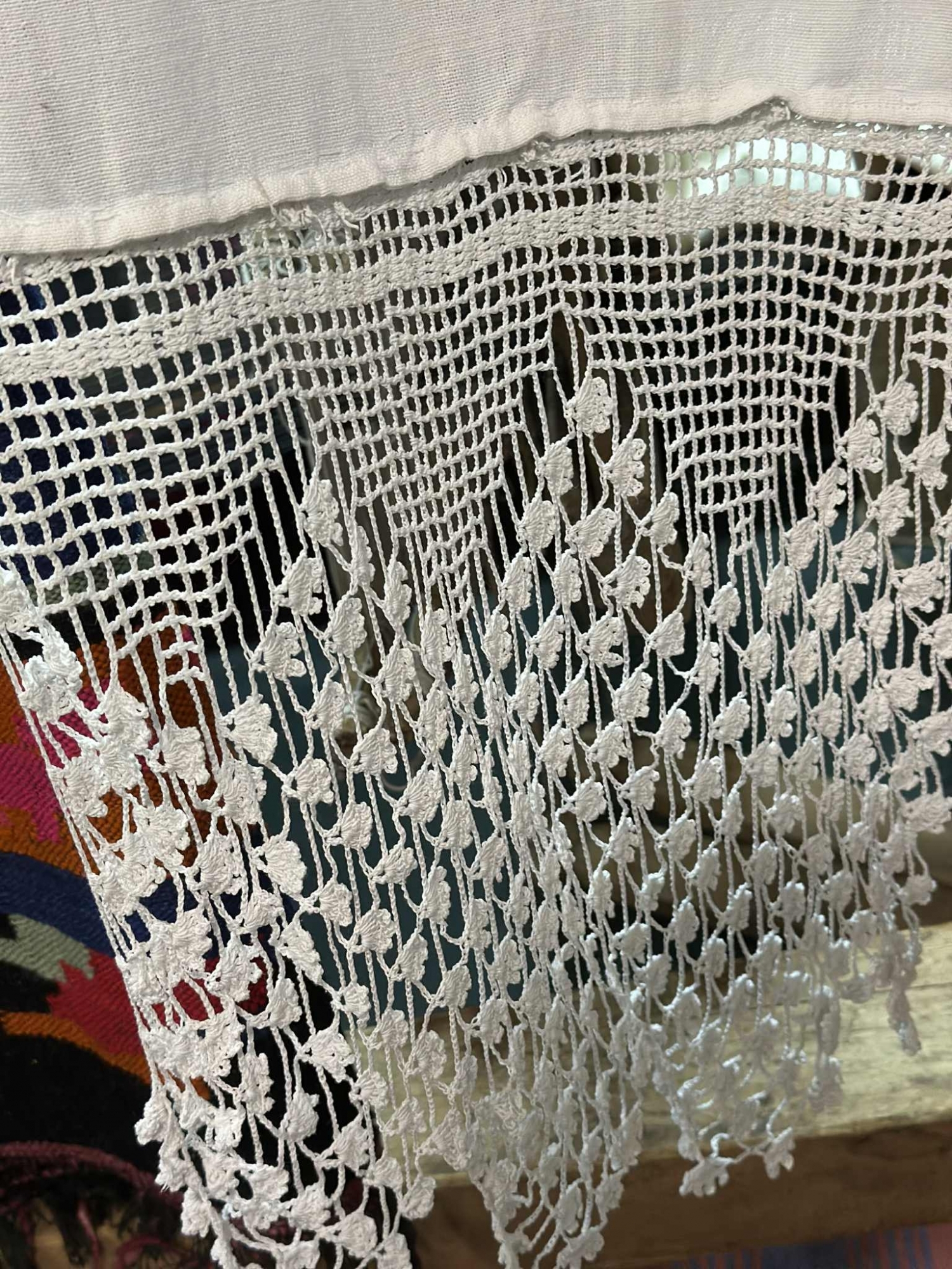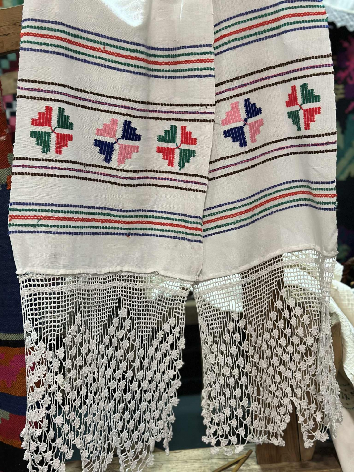 Prosop tradițional realizat pe fond alb, decorat cu motive geometrice dispuse în registre orizontale. Motivele sunt formate din patru elemente colorate (roșu, verde, roz, albastru închis), așezate simetric în formă de cruce sau trifoi stilizat. Între registrele decorative se regăsesc linii punctate orizontale în culori contrastante (verde, albastru, roșu, negru). Capetele prosopului sunt terminate cu o dantelă croșetată albă, bogată, în model de romburi și frunze, care conferă obiectului valoare estetică și meșteșugărească ridicată.