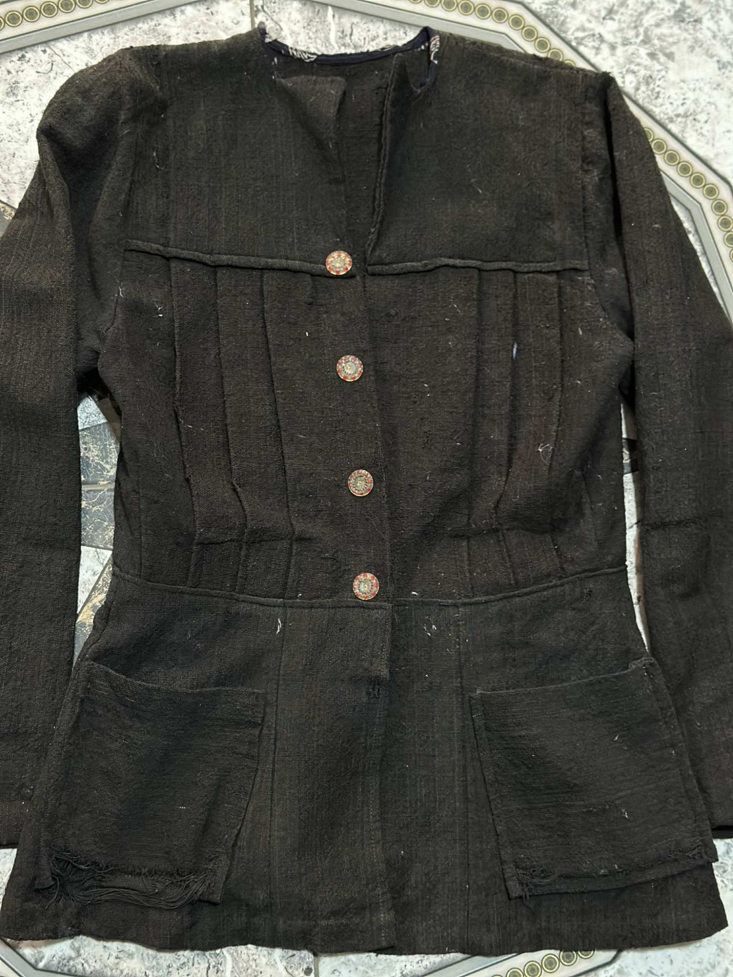 Țesătura densă și rezistentă sugerează o utilizare practică, specifică hainelor de lucru sau de port cotidian din mediul rural. Această piesă vestimentară reflectă simplitatea și sobrietatea costumului popular tradițional, păstrând totodată elemente estetice specifice epocii și zonei de proveniență.