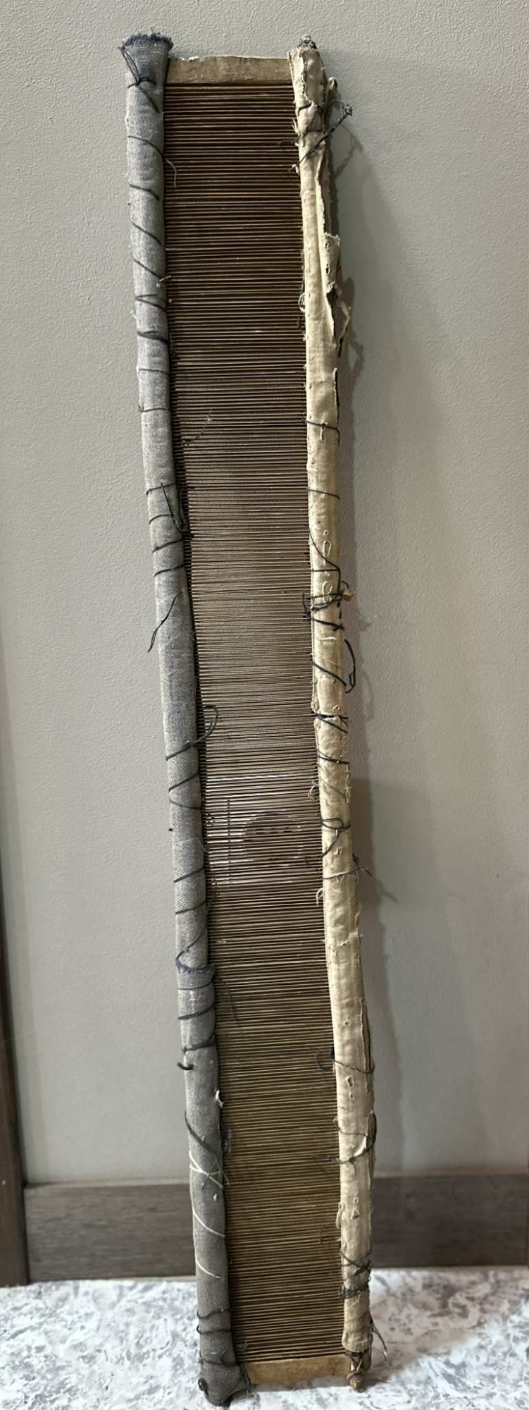 Are marginile cusute cu material mai gros, o parte de culoare albă, iar cealaltă- gri, cusută cu ață neagră, neuniform.