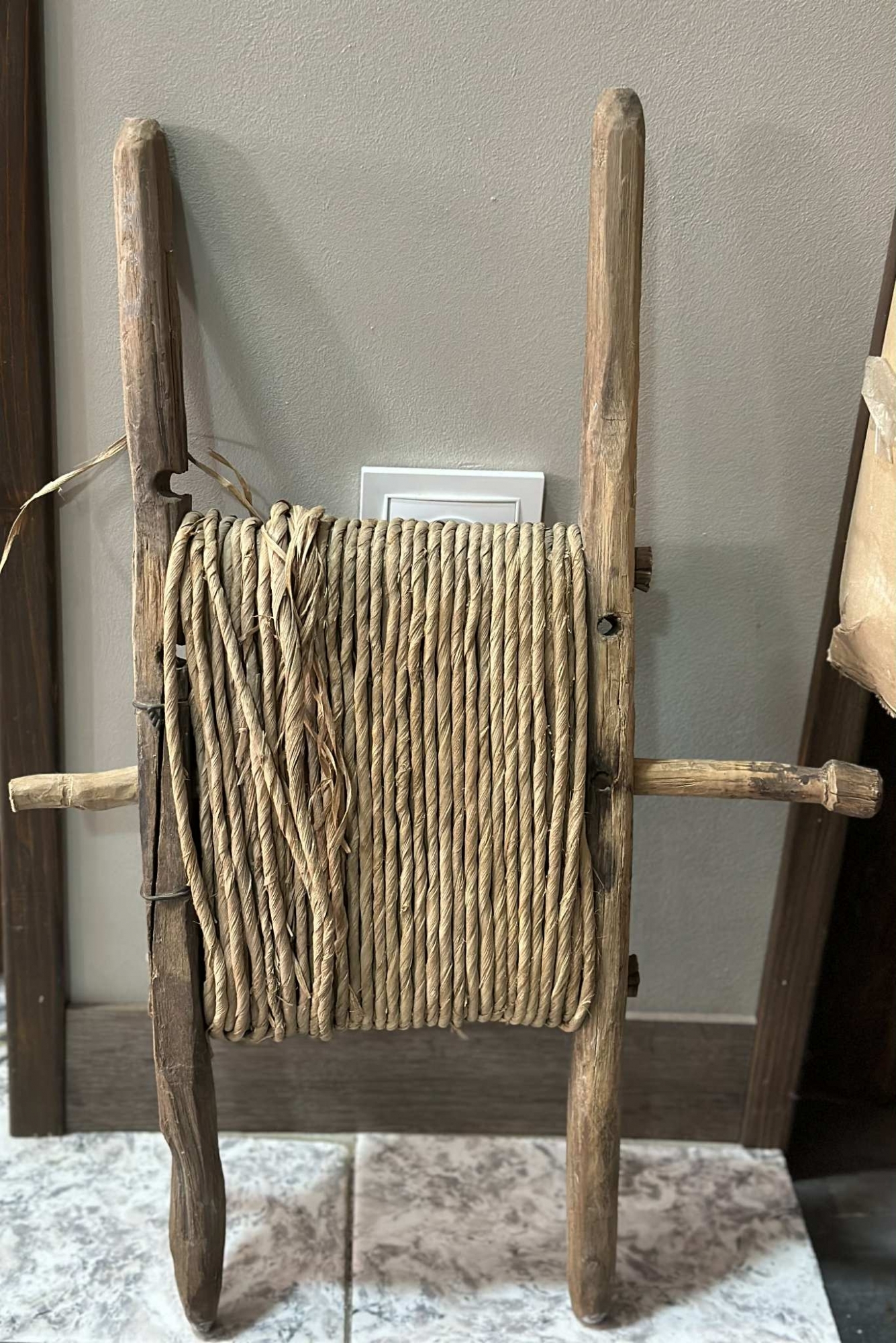 Obiect confecționat din două bețe paralele din lemn, unite la capete printr-un ax transversal pe care este înfășurată o sfoară de papură. Axul central este mobil, permițând rotirea pentru a derula sau înfășura sfoara. Lemnul poartă urme vizibile de lucru manual, cu muchii rotunjite și suprafața netedă de la utilizare îndelungată.
