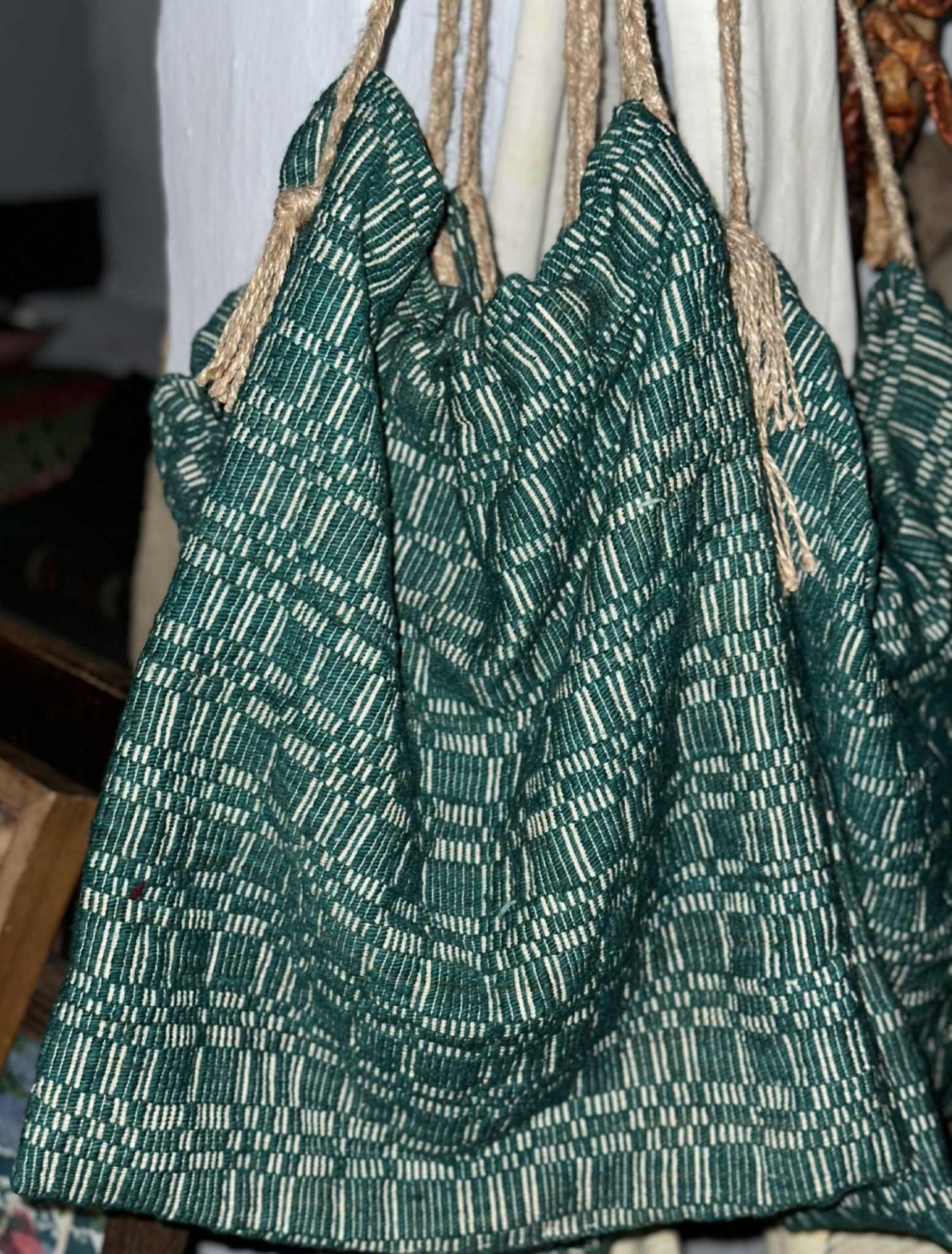 Torbă de formă dreptunghiulară, confecționată din material textil țesut, cu model geometric alcătuit din dungi și pătrățele dispuse ritmic, în nuanțe de verde închis și alb. Piesa este prevăzută în partea superioară cu șnururi din fire groase, răsucite, care servesc la închiderea și purtarea torbei pe umăr sau în mână. Țesătura este realizată manual la război, din lână subțire, specifică meșteșugurilor textile tradiționale. Torba era folosită pentru transportul diverselor obiecte personale sau a produselor mici, fiind un accesoriu practic, dar și decorativ, datorită modelului său țesut cu grijă.