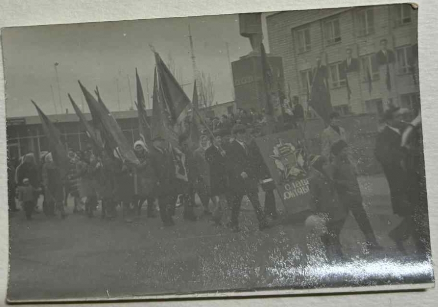Demonstrația de la 7 noiembrie. Prin fața tribunei și a monumentului lui Lenin V.I trece coloana Combinatului de deservire socială a populației. În imagine mulțime de bărbați, femei ce duc în mână steaguri, placate. La tribună conducerea raionului. În spatele tribunei și a monumentului este clădirea Comitetului Executiv Raional Edineț.
