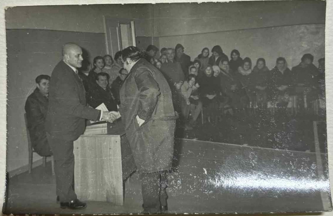Directorul Școlii medii N1 Șincariuc M.I aduce mulțumiri directorului Uzinei de mașini pentru prelucrarea lemnului- Naimușin pentru aportul adus la construcția și deschiderea sălii sportive în școala medie N1. În imagine mulțime de profesori și elevi ce stau pe scaune și ascultă.
