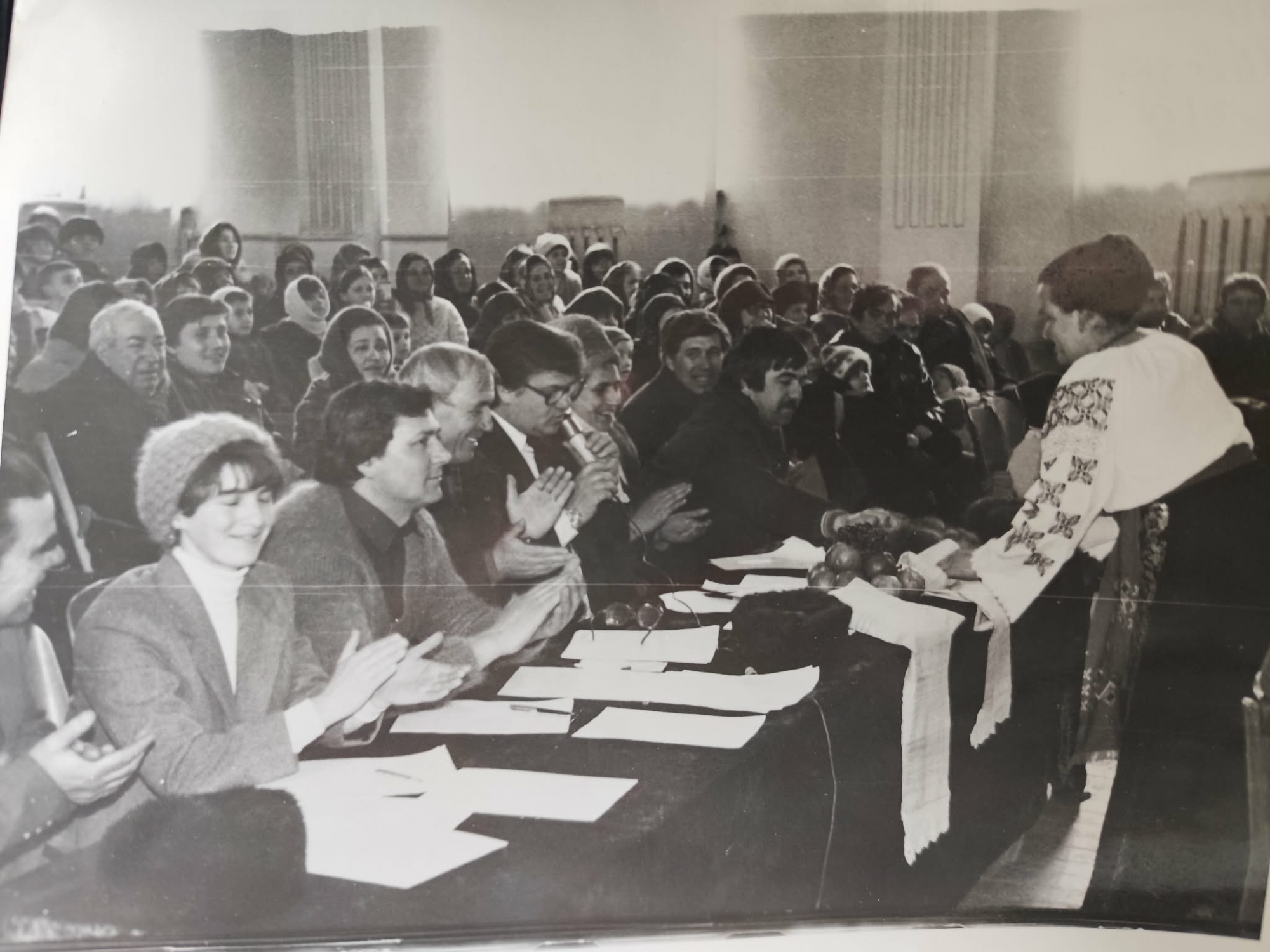 Fotografia alb negru prezintă în prim-plan membrii juriului la concursul ,,Haideți Fetelor,, de la stînga la dreapta aceștia sunt Brînză Vasili-președintele sovietulu sătesc, Petrenco Tatiana- profesoară de muzică, Plăcintă Vasili- director Casa de Cultură, Geantîc Ion- președintele organizației sindicale a colhozului Moldova, Grecu Dumitru-profesor de limba română, Niculiseanu Maria- asistentă medicală, Nicolae Constantin-conducătorul colectivului de dans ,,Vatra Horelor,, , Popa Vasili. Aceștia sunt îmbrăcați în haine de epocă (sacouri, pulovere pe gât) și aplaudă și interacționează cu doamna din fața lor, îmbrăcată în haine tradiționale. Sala este plină de spectatori, majoritatea femei purtând baticuri, ceea ce sugerează o participare activă a comunității rurale la evenimentele organizate.