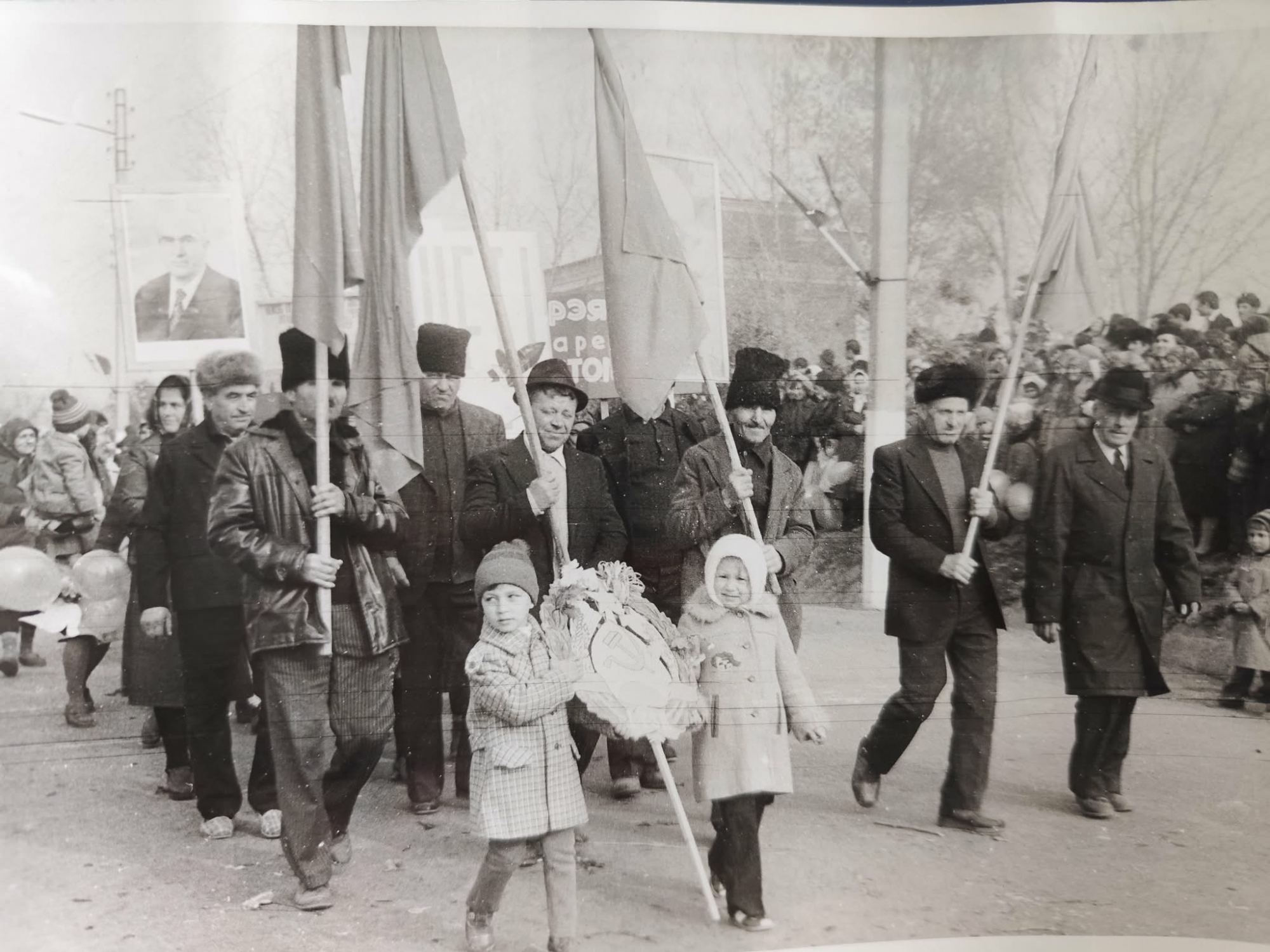 Fotografia alb negru prezintă defilarea organizațiilor pe strada centrală cu ocazia sărbătorii muncii. În centrul imaginii, este Brigada Nr. 5 de vii, în frunte cu doi copii mici (un băiat în stânga și o fetiță în dreapta) care țin împreună un panou circular decorat, care pare să conțină simboluri de stat - secera și ciocanul stilizate. Copilul din stânga poartă o haină în carouri și o căciulă tricotată, iar fetița poartă o hăinuță deschisă la culoare cu glugă. În spatele copiilor se află de la dreapta spre stînga conducătorul brigăzii Petrenco Nicolae împreună cu grupul de mecanizatori și vieri, membri ai brigăzii Nr. 5, îmbrăcați în haine de iarnă/toamnă: paltoane grele, scurte de piele sau stofă și, foarte caracteristic, căciuli de miel (cușme) sau pălării. Bărbații poartă steaguri mari, prinse pe suporturi lungi de lemn. În partea stângă, sus, este purtat portretul înrămat al lui Leonid Brejnev. Pe marginea drumului, în partea dreaptă, se observă o mulțime de oameni care asistă la paradă. Se pot vedea copii ținând baloane.