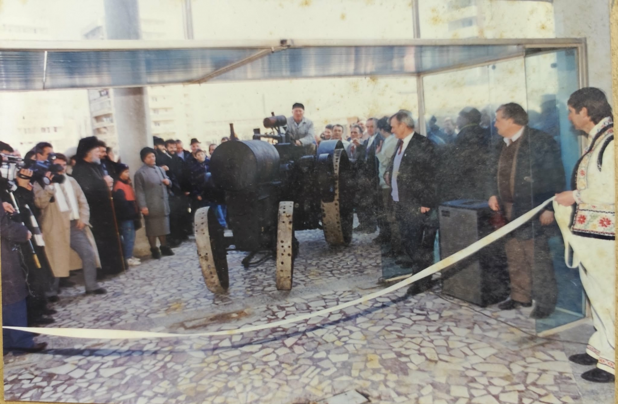 Piesa centrală a fotografiei este un tractor vechi, de colecție, aflat sub o structură protectoare din sticlă și metal. Este un model cu roți metalice, prevăzute cu crampoane (fără pneuri de cauciuc), specific începutului secolului XX. Pare a fi un tractor românesc timpuriu (cum ar fi primele modele IAR). Tractorul este așezat pe o pardoseală din mozaic cu forme neregulate, în interiorul unui spațiu amenajat special pentru expunere. În jurul tractorului este adunată o mulțime diversă, sugerând importanța evenimentului pentru comunitate. În partea dreaptă, vedem bărbați la costum, unul dintre ei purtând o eșarfă tricoloră (posibil primarul localității). În stânga se observă un preot cu barbă albă, sugerând că a avut loc o slujbă de sfințire. În extrema dreaptă, un bărbat poartă un costum popular românesc (văzut din profil), accentuând caracterul patriotic al evenimentului. În partea stângă apare un cameraman cu un echipament video masiv, specific televiziunilor din acea perioadă, pregătit să filmeze momentul tăierii panglicii. O panglică albă traversează prim-planul fotografiei, fiind pregătită pentru a fi tăiată oficial. Evenimentul are loc în fața unei clădiri moderne pentru acea vreme, cu ferestre mari din orașul Slobozia, județul Ialomița.