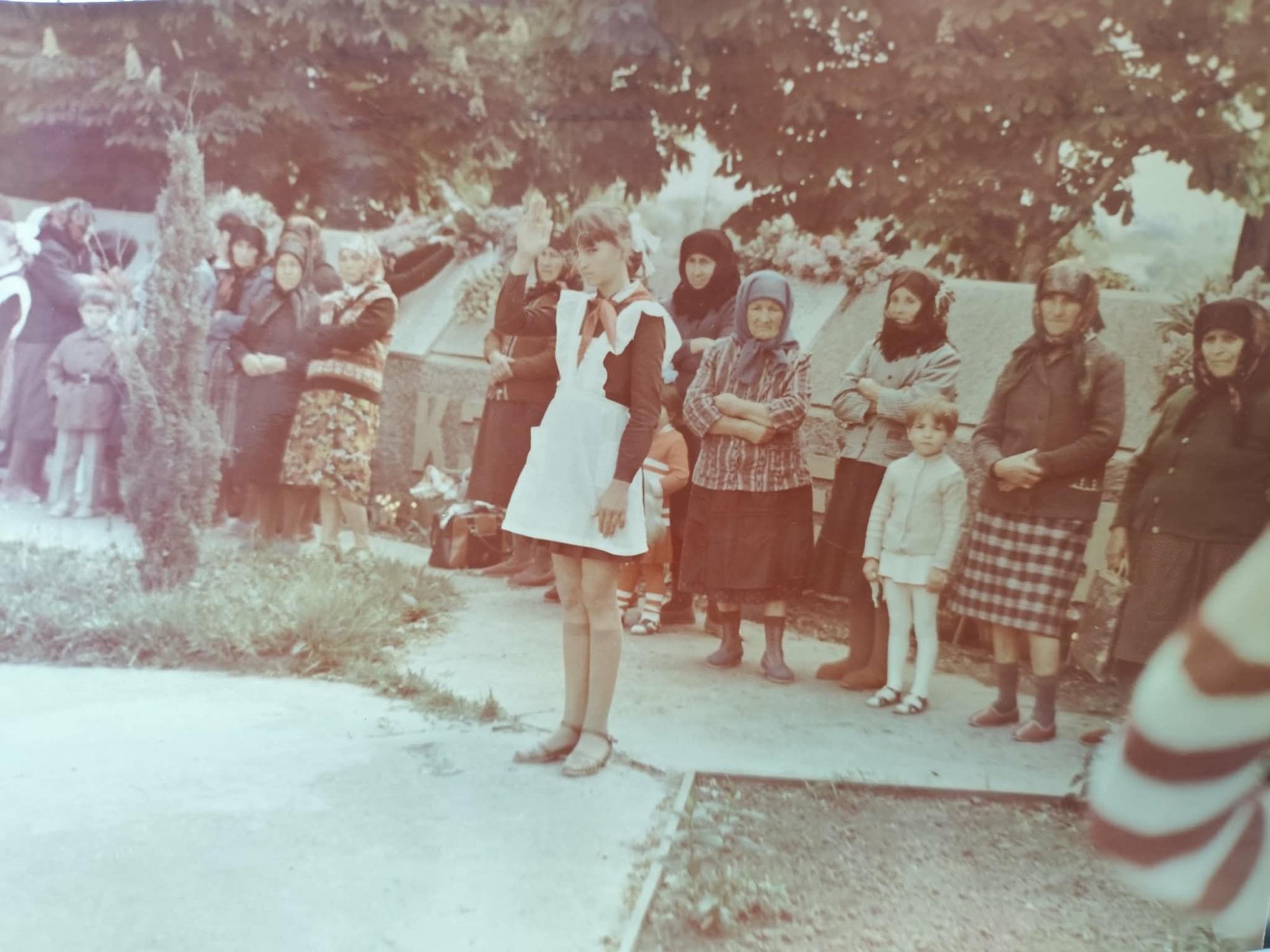 În centrul fotografiei color se află o tânără elevă care execută un salut oficial (mâna ridicată deasupra frunții, specific pionierilor). Aceasta poartă uniforma școlară clasică a acelei epoci: o rochie închisă la culoare, un șorț alb de sărbătoare cu bretele bufante și o eșarfă roșie la gât (cravata de pionier). Expresia fetei este serioasă și concentrată, reflectând importanța momentului. În spatele fetei se află un grup de localnici, majoritatea fiind femei în vârstă, văduve de război și câțiva copii. Femeile poartă haine tipice mediului rural de la acea vreme, baticuri legate sub bărbie, fuste lungi, jachete groase și veste tricotate. În dreapta fetei apare un copil mic îmbrăcat în alb, iar în stânga, în plan secund, un alt băiețel cu o geacă închisă la culoare. Oamenii privesc cu respect și atenție. Se observă monumentul comemorativ al eoilor căzuți în al Doilea Război Mondial, pe care sunt așezate coroane și buchete de flori. În spatele grupului sunt copaci cu frunziș bogat (probabil castani sau tei), care creează o boltă naturală deasupra scenei. În stânga fetei se află un arbust ornamental (conifer mic).