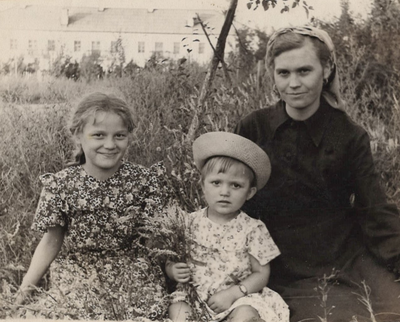 Reprezentate în aer liber, într-un câmp, așezate pe iarbă. De la stânga spre dreapta: Olga Copacinschi, îmbrăcată într-o rochie cu ornament floral, cu mâneca scurtă, părul străns la spate. Eugenia Vișnevschi este îmbrăcată intr-o rochie neagră cu mâneca lungă, pe cap poartă broboadă. Fetița ei este îmbrăcată intr-o rochiță albă cu ornament floral, cu pălărioară pe cap, în mânuță ține un buchet de flori de câmp.