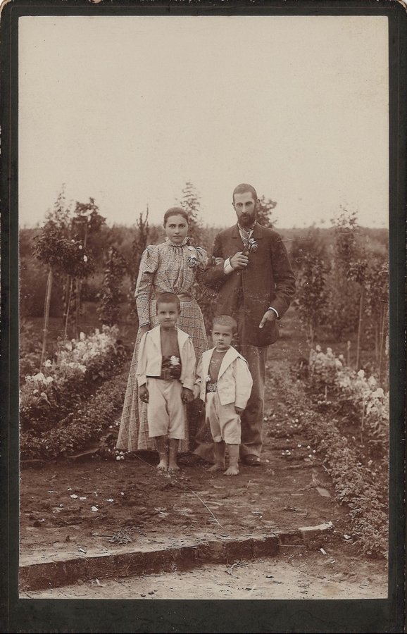 Elena și Gheorghe Lazo, împreună cu cei doi fii, Serghei și Boris, sunt reprezentați în grădină, pe fundalul tinerii livezi de la moșia Iezăreni. Elena, luată la braț de soț, este îmbrăcată într-o rochie lungă în carouri, cu gulerul ridicat pe gât și o curea încinsă la talie, părul strâns la spate. Gheorghe este îmbrăcat în sacou de culoare închisă, pantaloni largi de culoare gri, cu cravată la gât. Copii sunt îmbrăcați în cămăși gri, bluze și pantaloni scurți de culoare albă, desculți. Toți poartă câte-o floare: copii la cureaua de la brâu, iar cei maturi la piept. Fotografia a fost realizată de Poruznik, fotograf ambulant, care avea atelier în orașul Cernăuți. Ea este lipită pe carton. În partea de jos a cartonului se regăsește inscripțiile: „Poruznik” și „Czernovitz”. Pe verso sunt imprimate numele fotografului/atelierului, al orașului unde a activat și imaginile medaliilor, obținute de atelier.