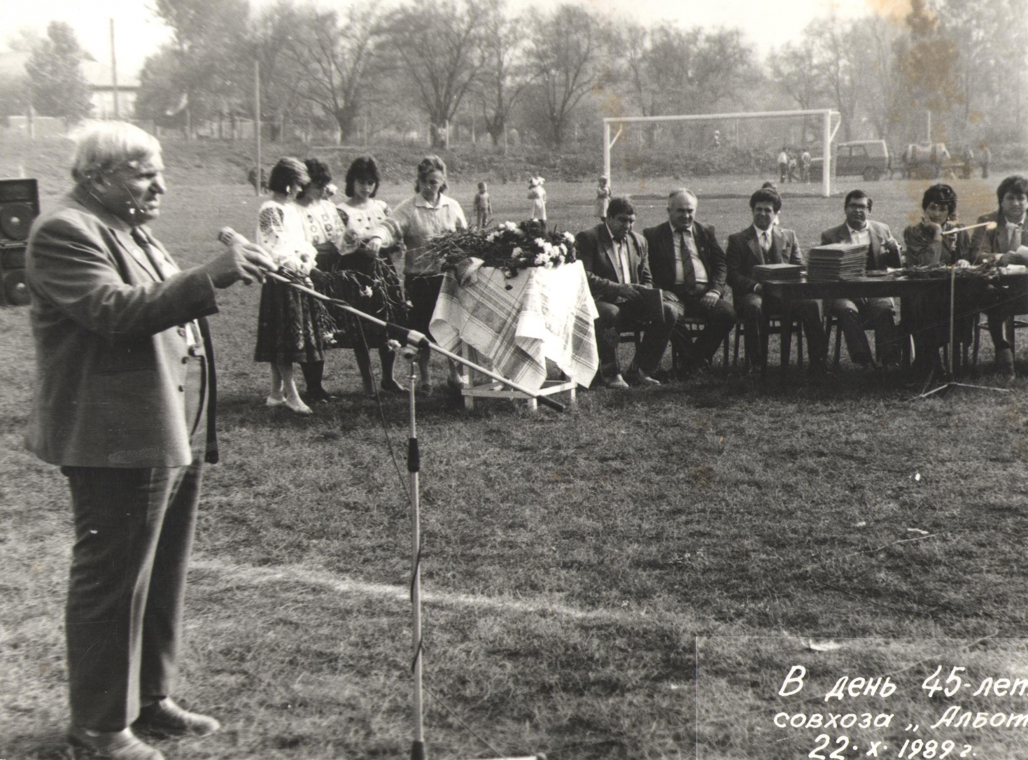 На фотография изображено празднование "45-летия совхоза-Албота" . Фотография выполнена в черно-белом цвете. Фотография — это изображение, созданное с помощью фотоаппарата, где световые лучи фиксируются на светочувствительной поверхности или в цифровом виде для получения визуального отображения объекта или сцены