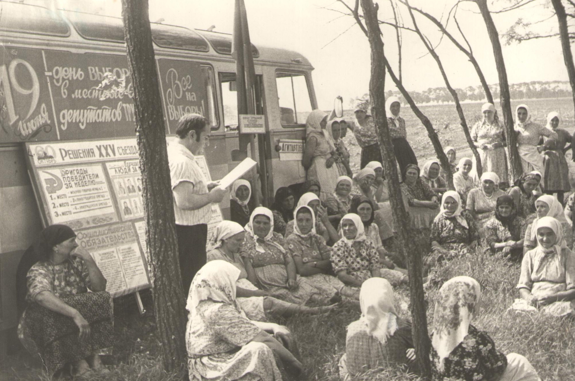 На фотографии изображены люди-рабочие в поле колхозе Родина . Фотография выполнена в черно-белом цвете. Фотография — это изображение, созданное с помощью фотоаппарата, где световые лучи фиксируются на светочувствительной поверхности или в цифровом виде для получения визуального отображения объекта или сцены