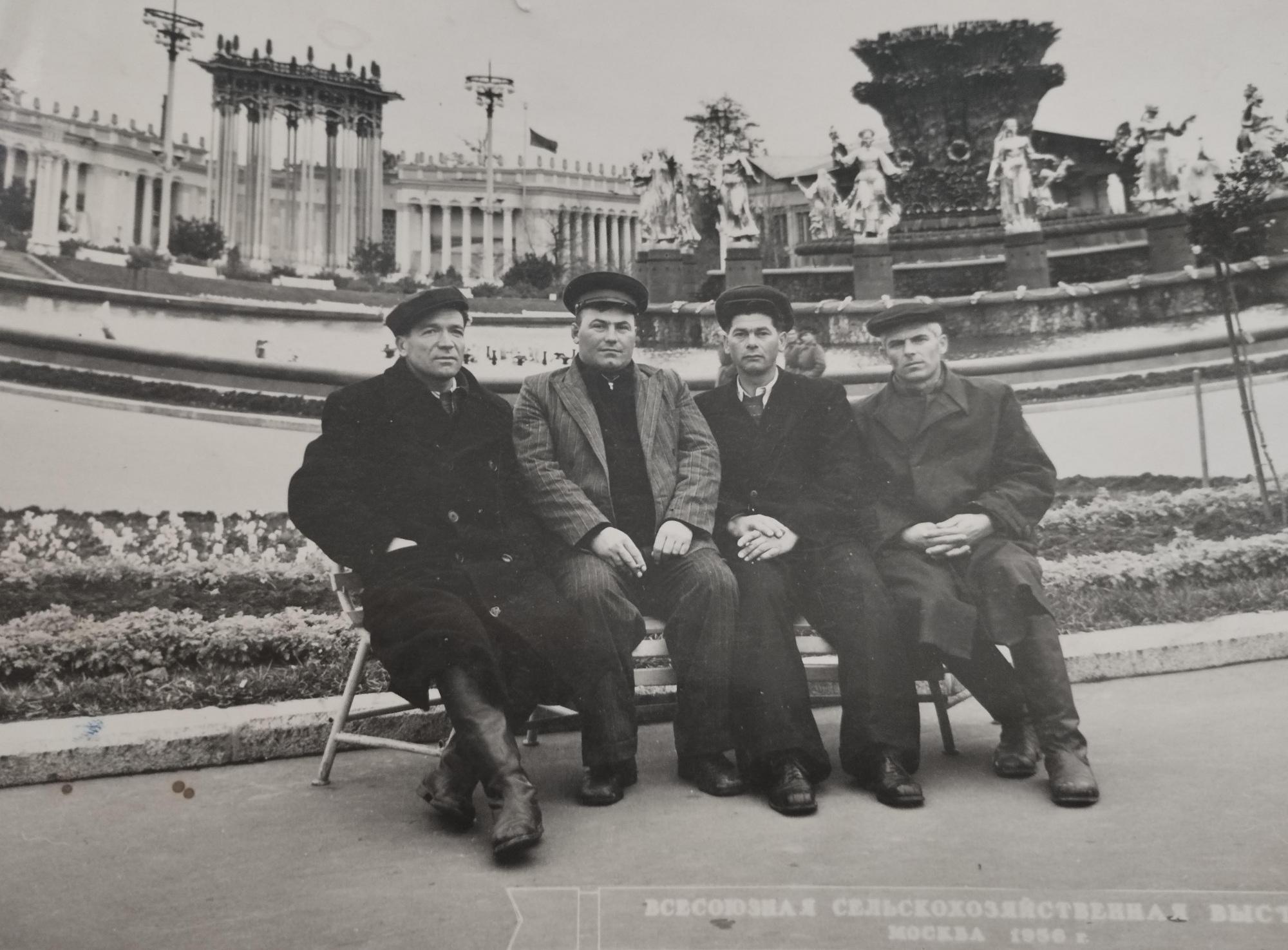 Fotografia lucrătorilor din colhoz lîngă havuzul Prietenia Națiunilor la expoziția din 1956 la Moscova
