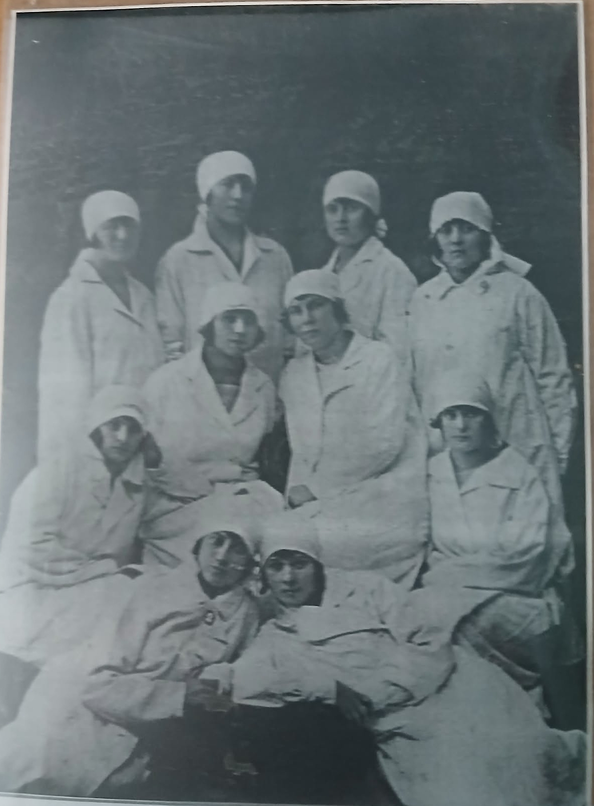 Fotografia reprezintă un grup de 10 tinere femei, îmbrăcate în uniforme medicale (halate deschise la culoare și bonete specifice personalului sanitar). Personajele sunt dispuse pe mai multe rânduri, unele în picioare, altele așezate.