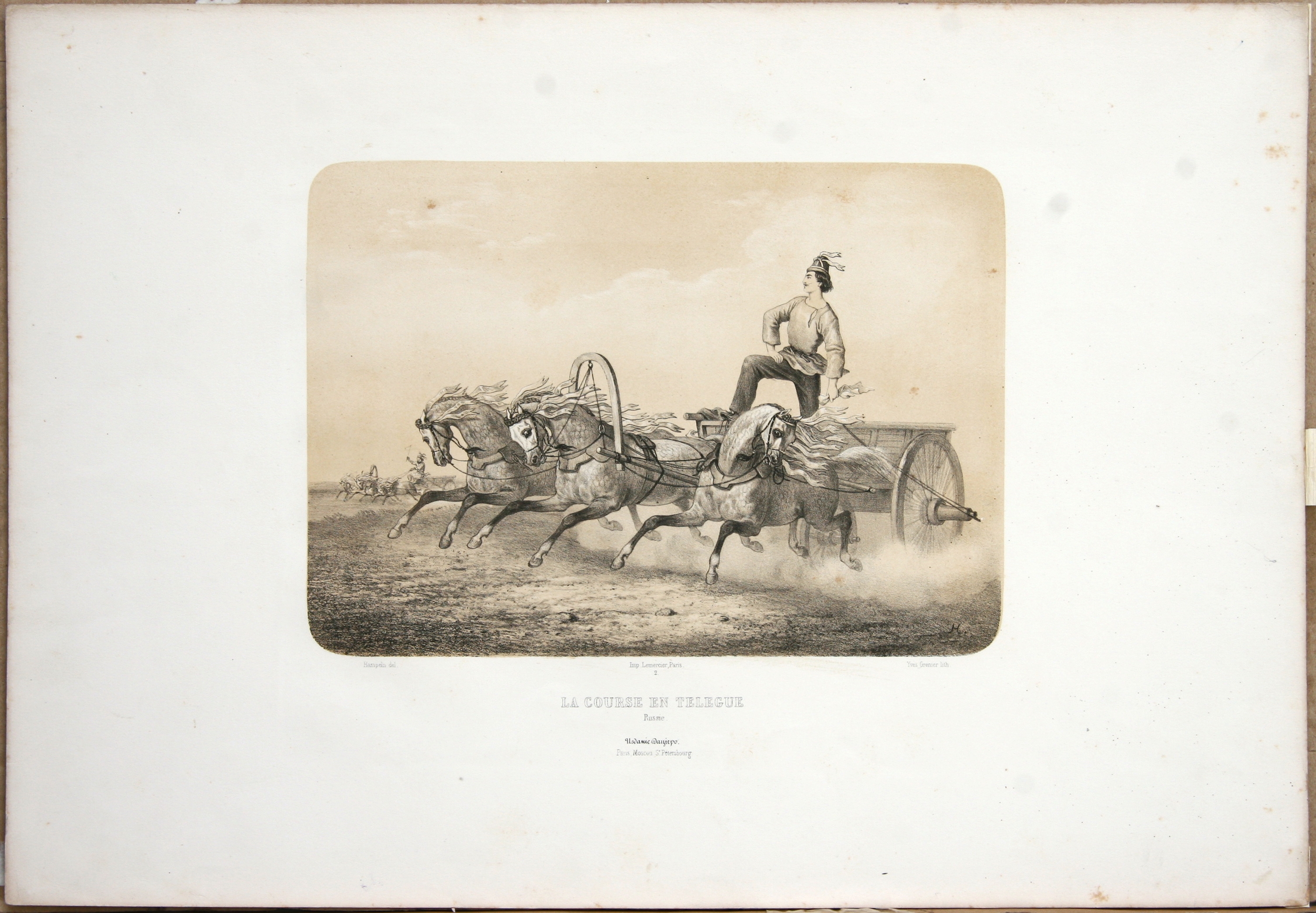 Prim plan: o căruță trasă de 3 cai, condusă de un bărbat în haină populară. Jos drp: monograma H. Sub imagine: inscripții gravate în franceză.