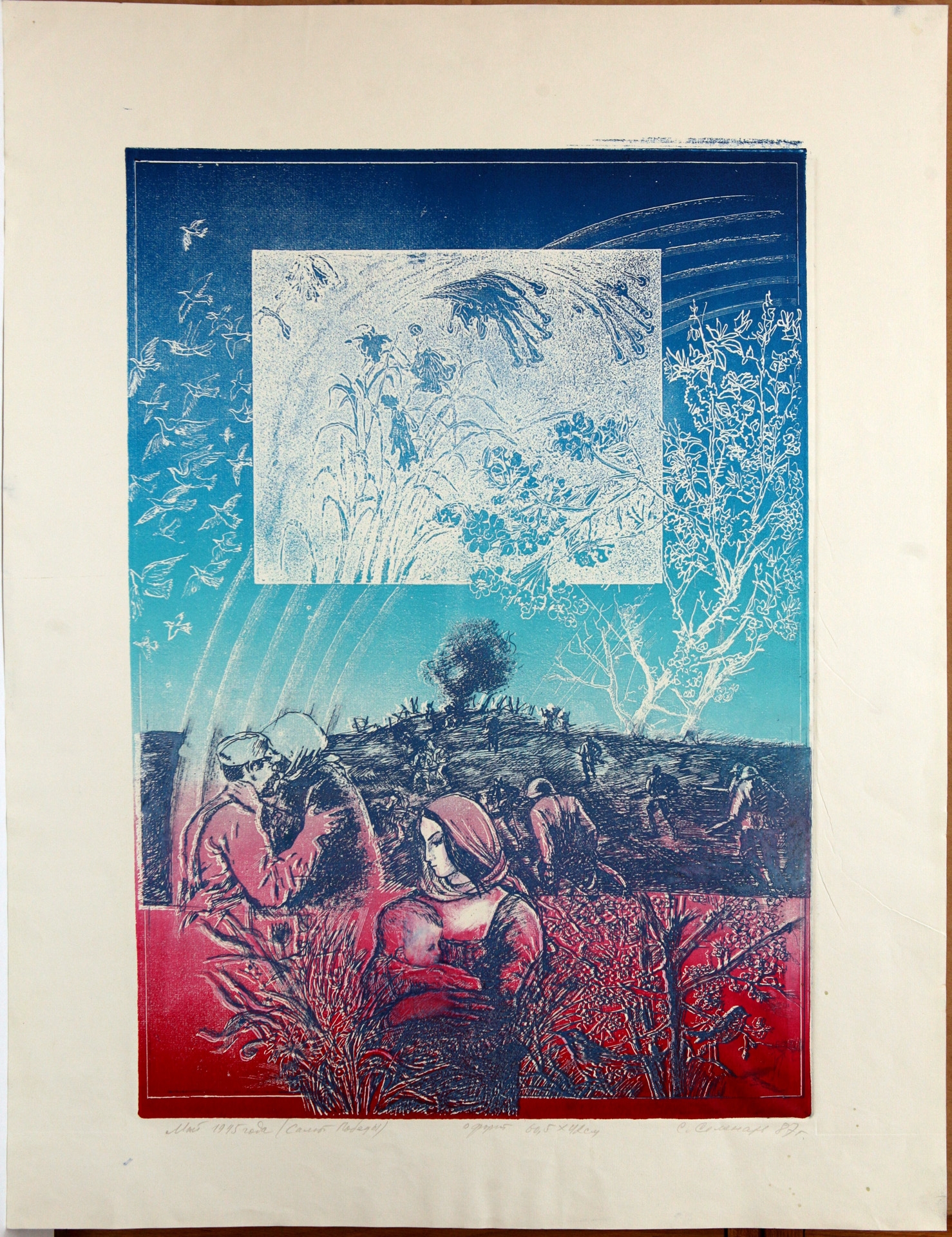 În centru - o femeie tînără, cu un copil în brațe, văzută din profil spre stînga. În stînga - o bătrînă îmbrățișează un ostaș. În plan secund - cîmpul de luptă cu militari în atac. Pe fondal de cer - salve de tun.