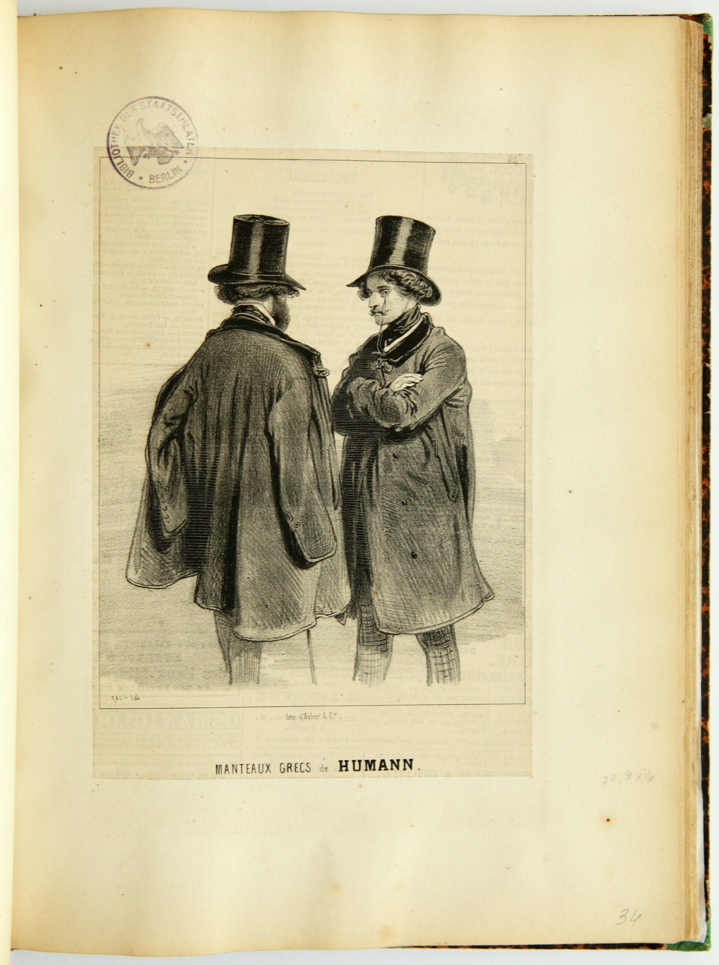 2 bărbați în plină statură. Cel din stg e văzut din spate. Cel din drp: 3/4 stg, cu mîinile încrucișate la piept. Ambii poartă mantouri, jobenuri.