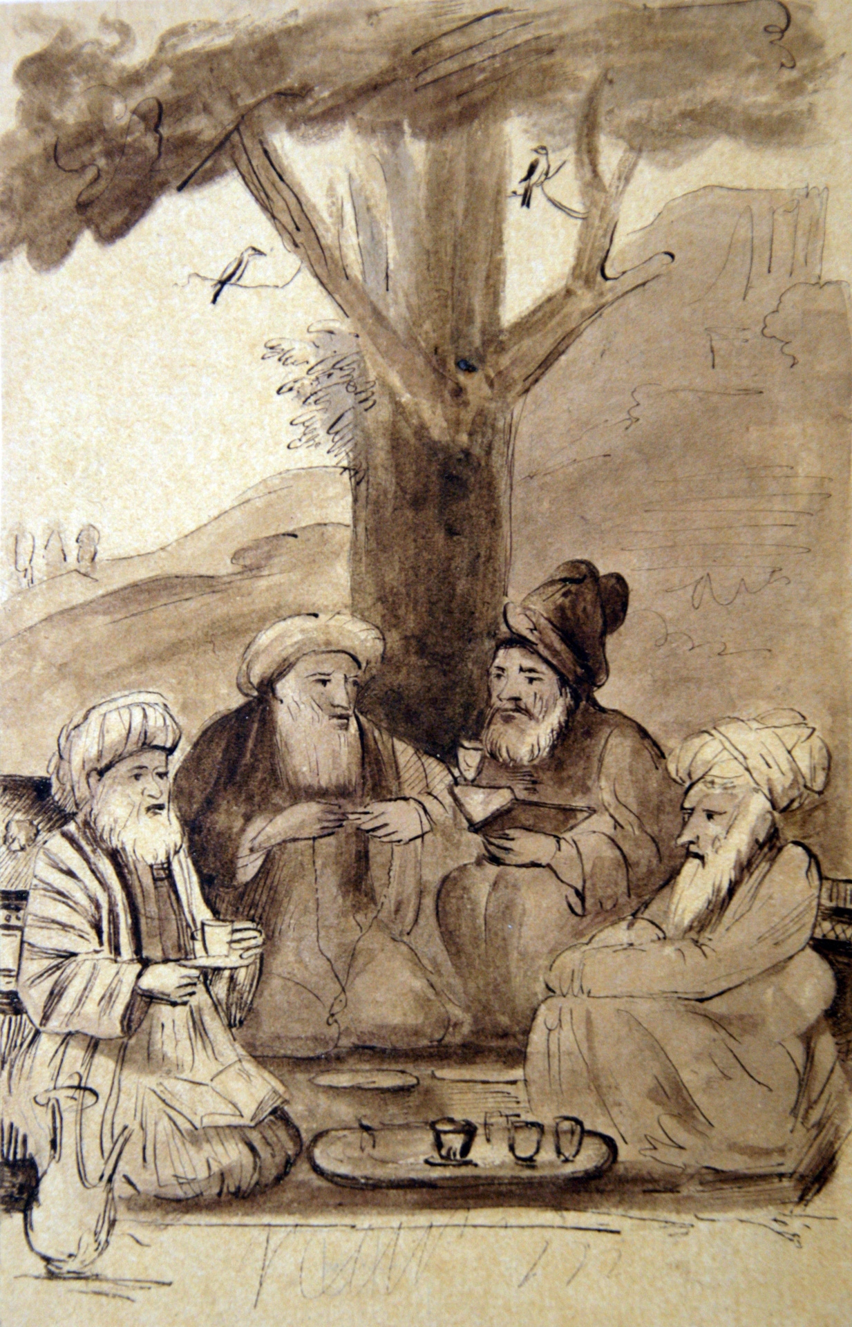 cel din stg e în genunchi; toţi poartă veşminte orientale, pe cap - turbane.