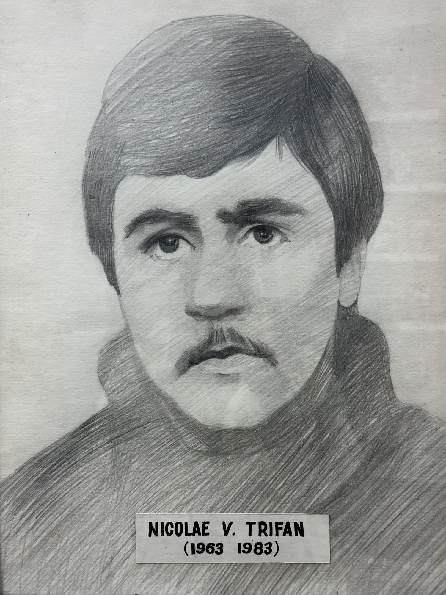 Portret de bărbat tînăr, redat bust, semi-profil spre stînga. Acesta este îmbrăcat într-o bluză cu gîtul acoperit, de culoare închisă. Fața este alungită, ochi mari și rotunzi și privirea ușor ridicată, sprâncene groase, nas drept proporționat și buze voluminoase, cu mustață tunsă scurt. Expresia feței este serioasă și ușor îngîndurată. Părul este tuns mediu, cu volum, pieptănat cu breton dat pe o parte. Umbrele și hașurile sunt dense, bine lucrate, conferind volum feței și hainelor
