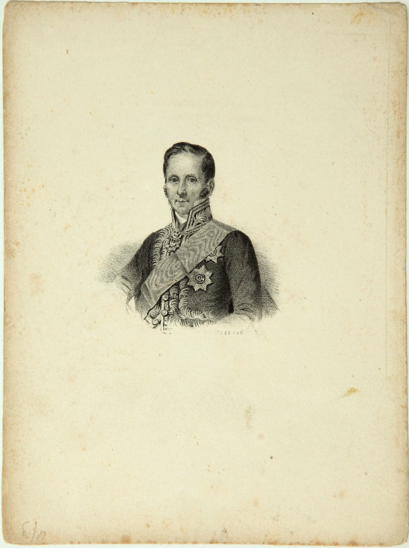 bărbat, bust, 3/4 stg; are păr scurt, pieptănat cu cărare în stg. Poartă uniformă militară de gală, deasupra - panglică legată oblic. La piept, stg: 2 decorații.