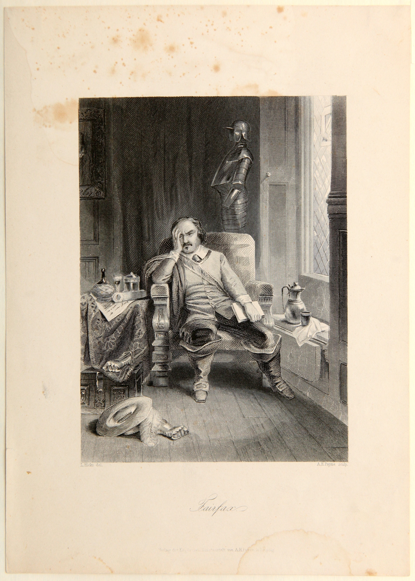 Portret de bărbat redat șezând în fotoliu cu capul sprijinit într-o mână, în cealaltă - ține o carte deschisă. Fond - interior cu fereastră în dreapta, stânga - o masă cu diverse obiecte, la spate - manechin cu zale, jos - o pălărie, un cufăr.