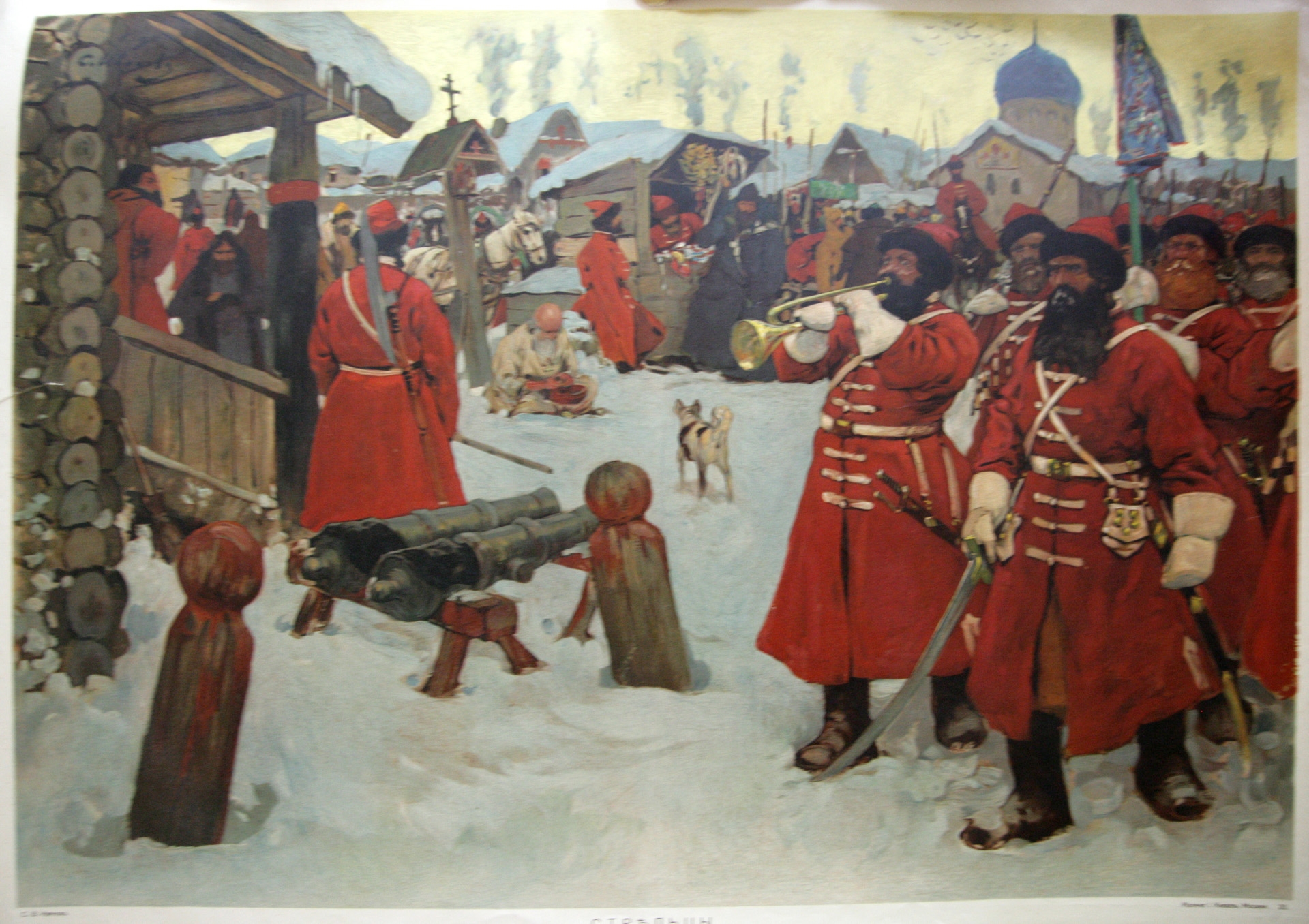 În prim plan, extrema drp - grup de bărbaţi în diverse gestici şi atitudini: unul cîntă la trompetă, altul cu sabia în mînă . Plan secund: o aglomeraţie de oameni, mediu rural de iarnă , surprinşi în mişcare, în diverse gestici. Compoziţie realizată în nuanţe de alb, sur, roşu, maro etc.