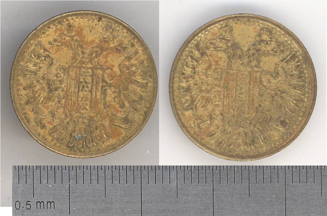 Pe ambele suprafeţe - o stemă de stat (acvilă bicefală încoronată, scut pe piept, în gheare - semne regale). Muchie netedă, margine - ornament din reţea de puncte.