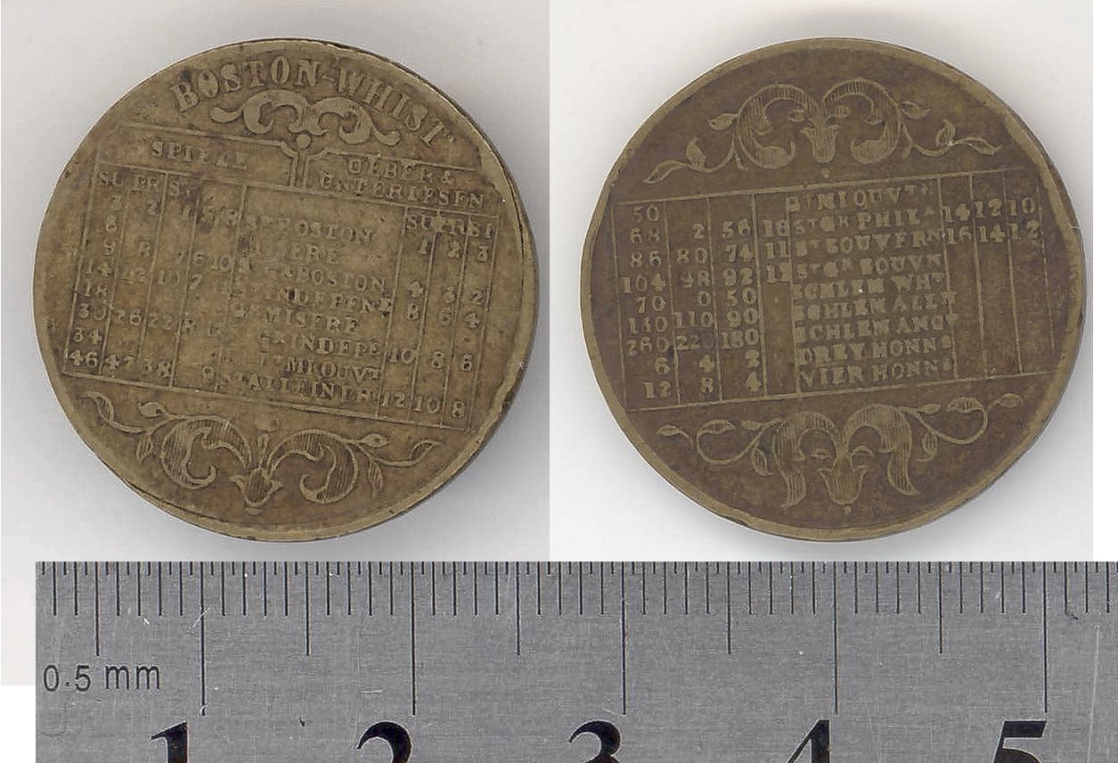 Pe ambele suprafeţe, la centru - tabel dreptunghiular cu 8 coloane, sus şi jos - ornamente vegetale. Legendă, pe avers, margine sus: Boston Whist. Muchie netedă, uşor înălţată.