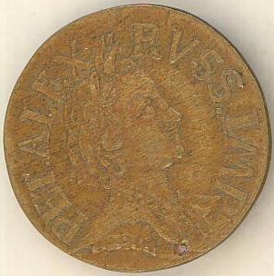 rotund cu muchie netedă. Avers: bust de bărbat încununat cu lauri văzut în profil drp - efigia lui Petru I, în jurul valorii - inscripții. Revers: la centru într-un cerc concentric - un număr conturat de motiv floral și punctiform.