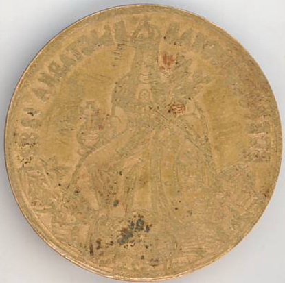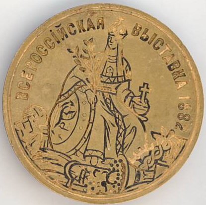rotund cu muchie netedă. Avers: imaginea unei femei așezate, la picioarele ei sunt atribute care aparțin diferitor domenii: industria, agricultură și arte; sus în arc de cerc - inscripții și milesimul care marchează evenimentul.