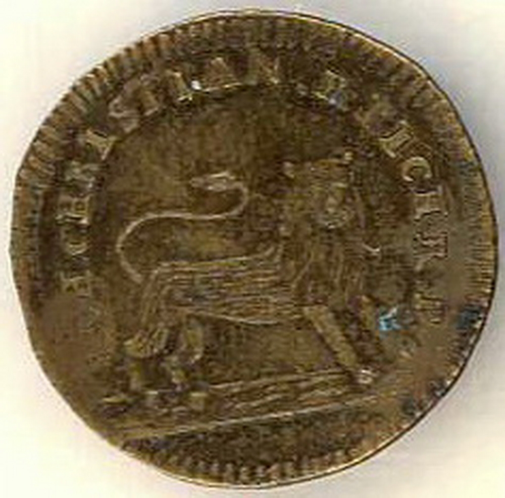 rotund, cu muchie netedă și cerc striat. Avers: portret de bărbat cu păr lung adunat la spate, în profil drp; în jurul valorii - inscripții. Revers: un leu la centru; la margine sus - inscripții.