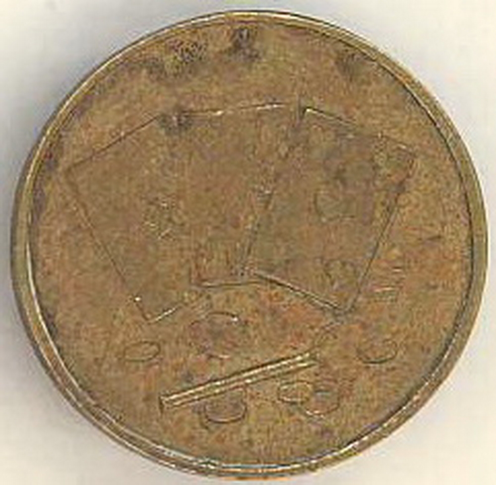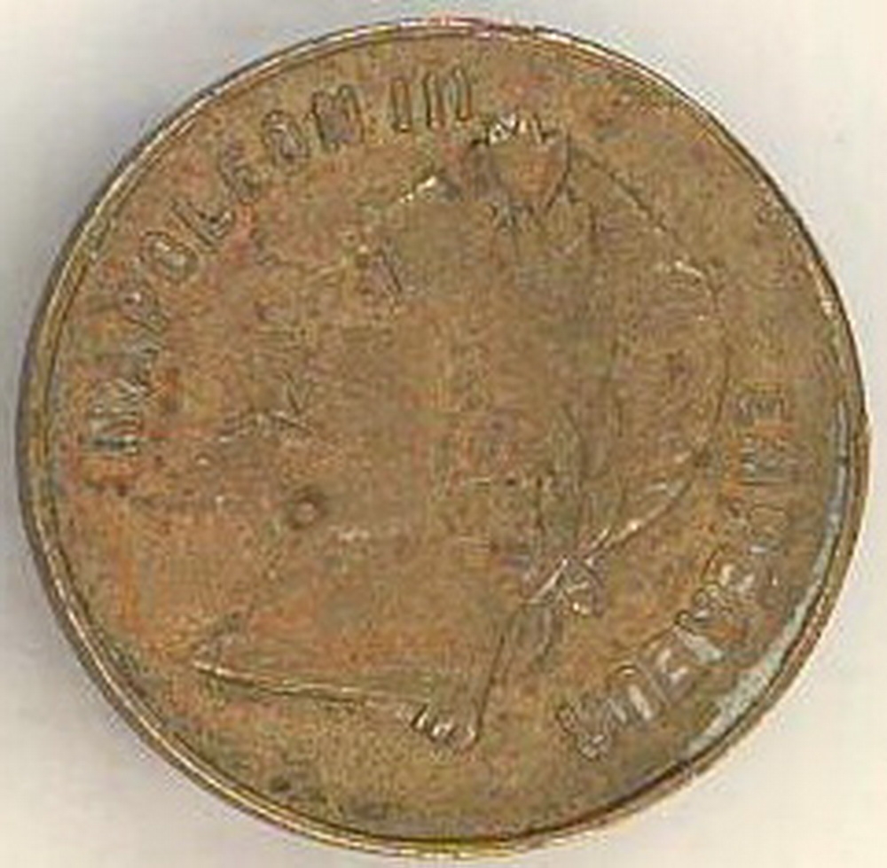 rotund, cu muchie netedă. Avers: capul lui Napoleon III, în profil stg; în jurul valorii - inscripții. Revers: 3 cărți de joc, zaruri, jetoane de poker și o țigară fumegînd.