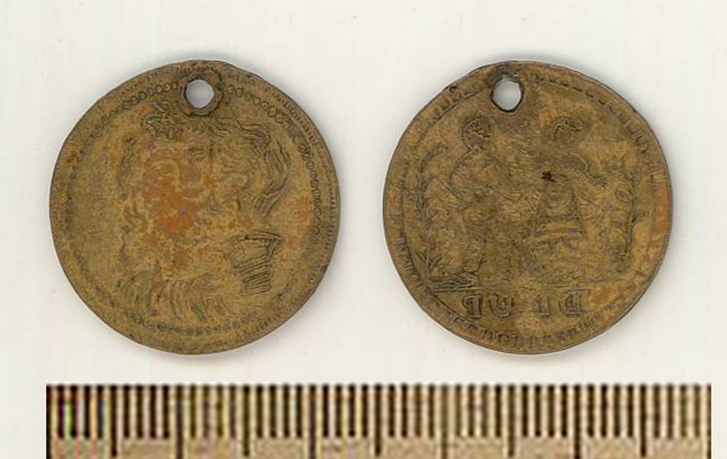 avers: bărbat cu baston şi femeie, ambii în plină statură, poartă haine ţărăneşti, lateral - flori. Legendă: 4 litere întoarse invers. Revers: o femeie, anfas, bust, cu păr lung şi ondulat. Muchie netedă, pe revers - o reţea de linii şi puncte.
