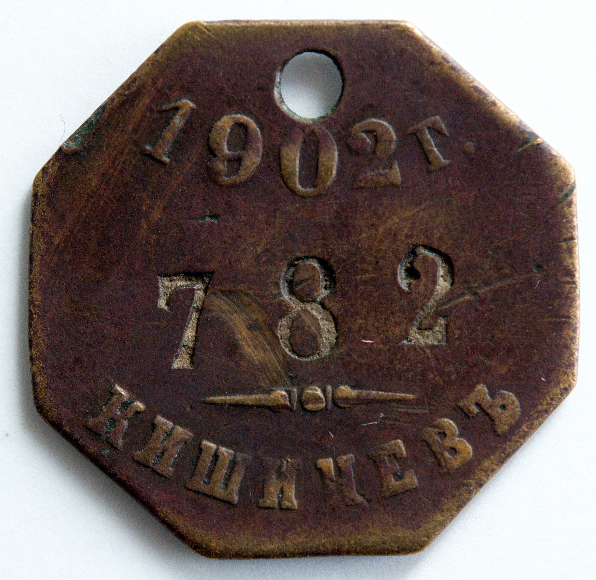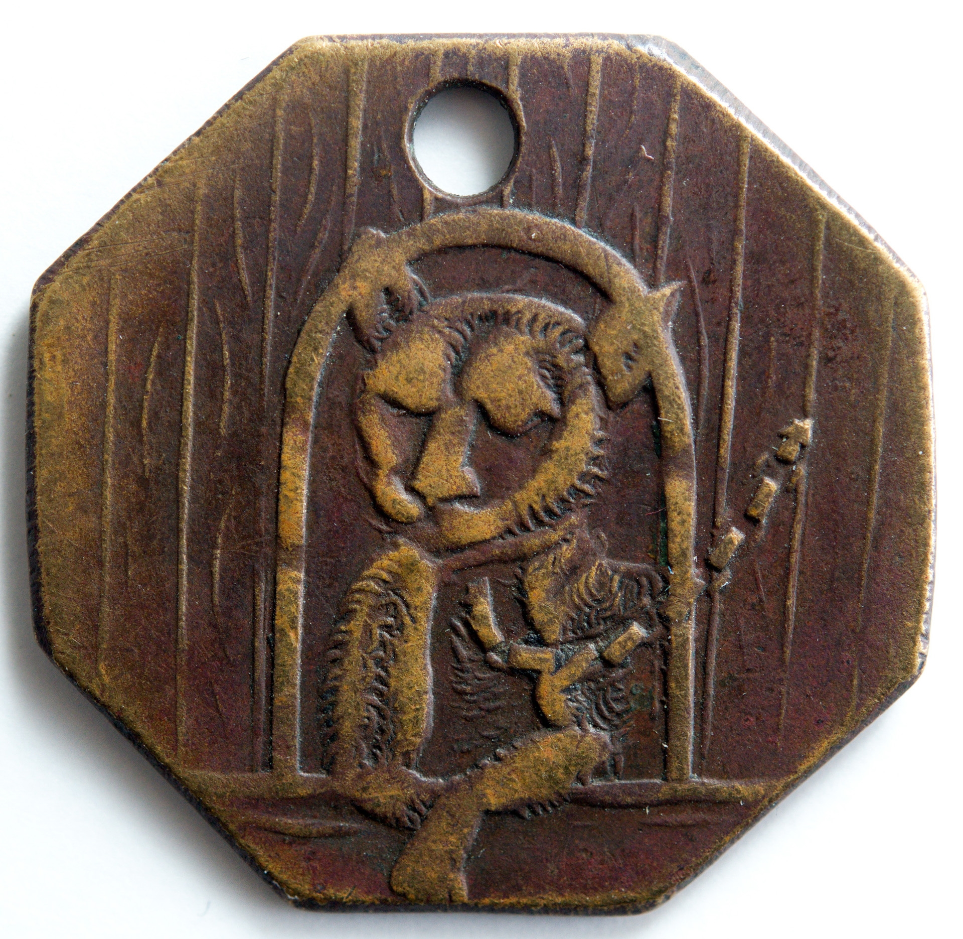 Jeton octagonal, cu orificiu sus. Avers: un căţel în cuşcă, ţinut în lesă. Revers: legenda în 3 rînduri.
