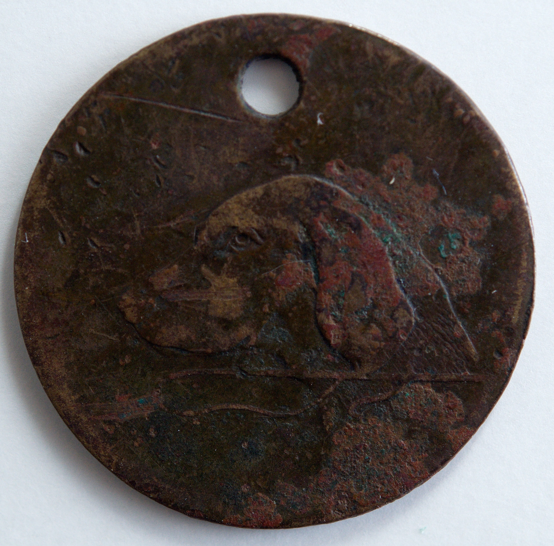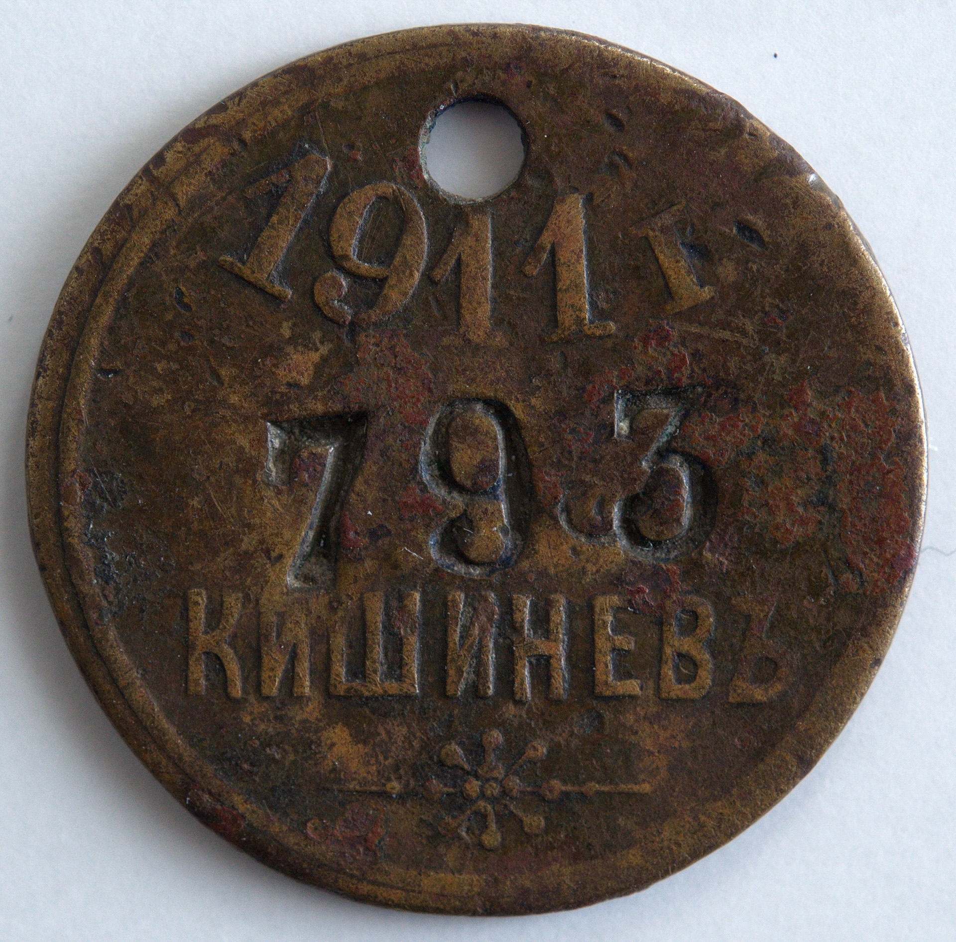 Jeton rotund, cu orificiu sus. Avers: un căţel cu urechi lungi. Revers: legenda în 3 rînduri.