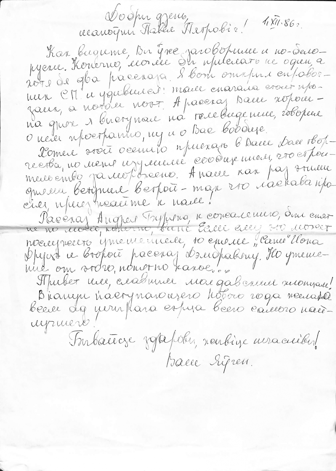 Boțu, Pavel. Manuscris olograf. Scrisoare fără plic adresată lui Pavel Boțu, Prim-Secretar al Comitetului de Conducere al Uniunii Scriitorilor din Moldova, recepționată din RSS Belarus la data de 1 decembrie 1986. Scrisoarea este scrisă olograf în limba rusă și limba bielorusă cu stilou în culoare neagră. Pe prima pagină, sus colț dreapta este scrisă data: „1. XII. 86”. Este semnătura ilizibil a autorului scrisorii. Pe verso: este scrisă adresa Uniunii Scriitorilor din Moldova.