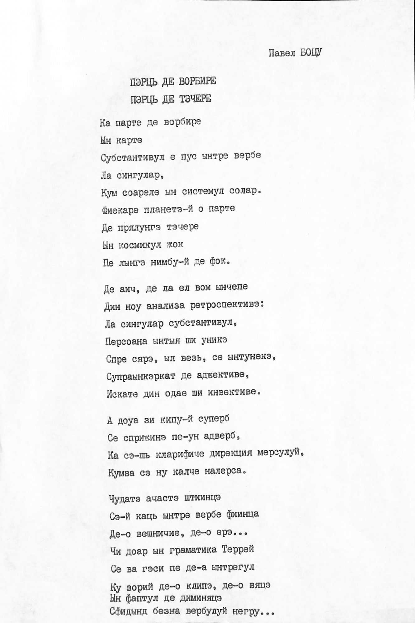 Boțu, Pavel. Manuscris dactilografiat. Poezia „Părți de vorbire părți de tăcere” de Pavel Boțu este inserată pe o pagină. Manuscrisul dactilografiat este scris în limba română cu caractere chirilice. Fără datare.