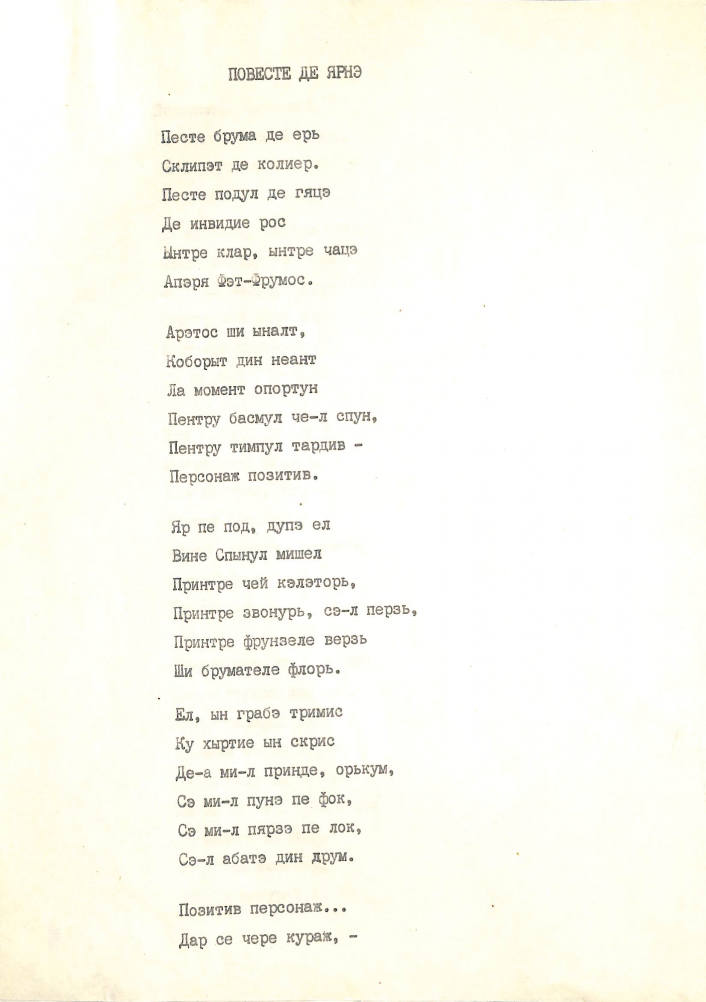 Boțu, Pavel. Manuscris dactilografiat: Poezia „Poveste de iarnă” de Pavel Boțu este inserat pe două pagini. Manuscrisul dactilografiat este scris în limba română cu caractere chirilice. Fără datare.