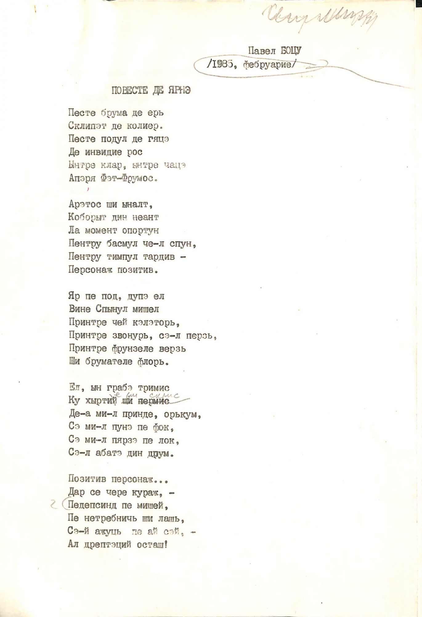 Boțu, Pavel. Manuscris dactilografiat: Poezia „Poveste de iarnă” de Pavel Boțu. Manuscrisul este inserat pe două pagini, iar mai jos este înscris: „17. 02. 85. Peredelkino”. Manuscrisul dactilografiat este scris în limba română cu caractere chirilice și completat cu scris olograf cu creion simplu în culoare neagră.