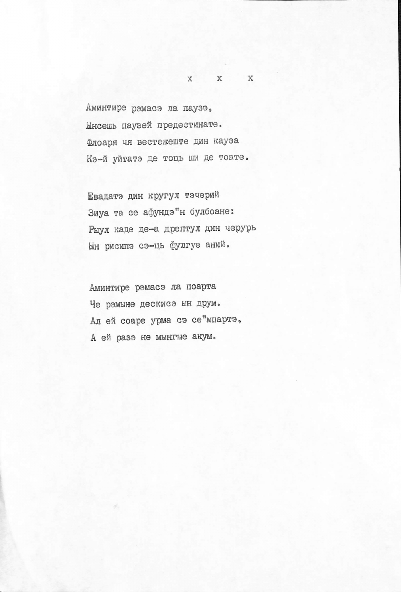 Boțu, Pavel. Manuscris dactilografiat. Poezia fără titlu începe cu: „Amintire rămasă la pauză...” și cuprinde trei strofe. Manuscrisul dactilografiat este inserat pe o pagină, textul scris în limba română cu caractere chirilice. Fără datare.