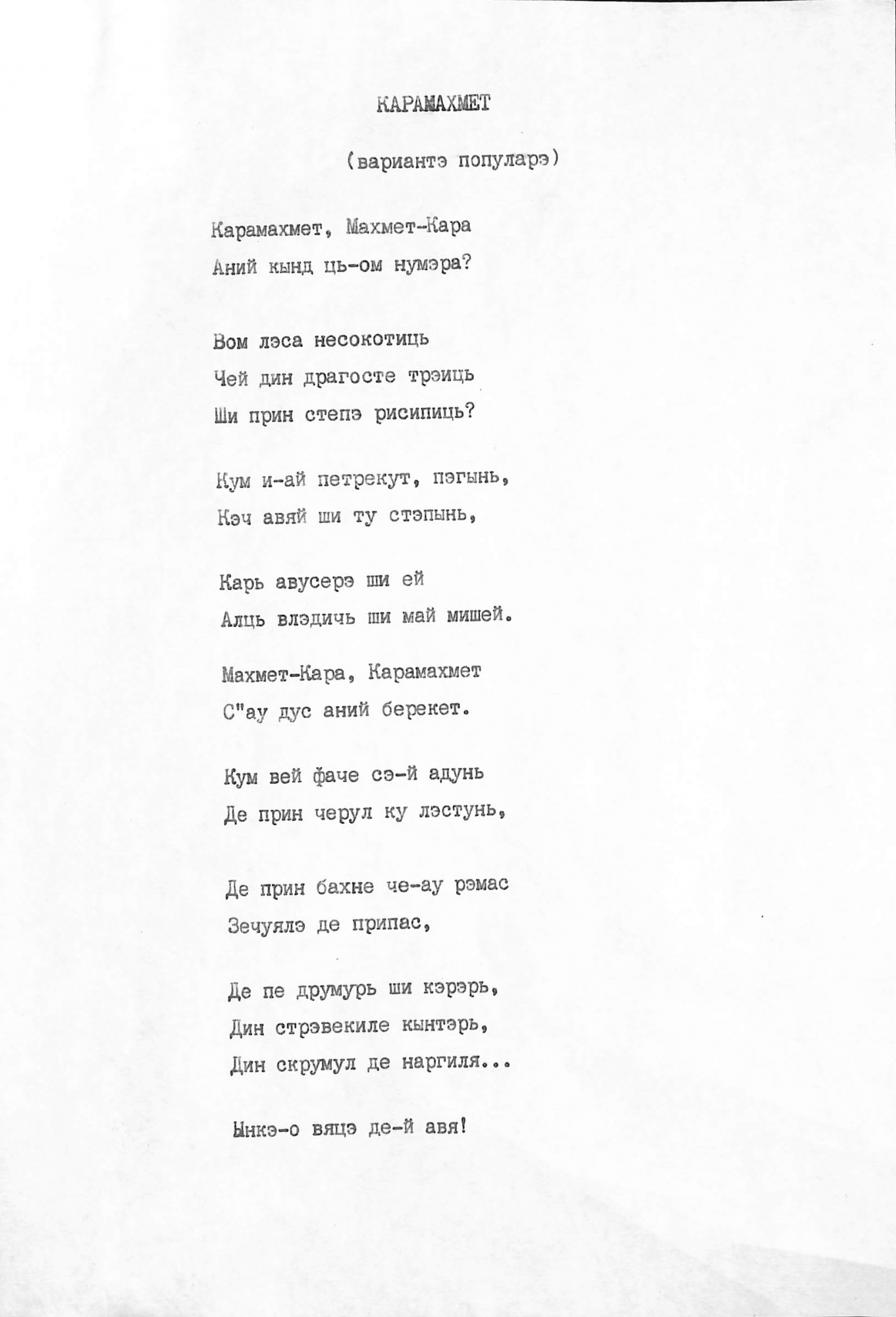 Manuscris dactilografiat. Poezia „KARAMAHMET” (variantă populară)