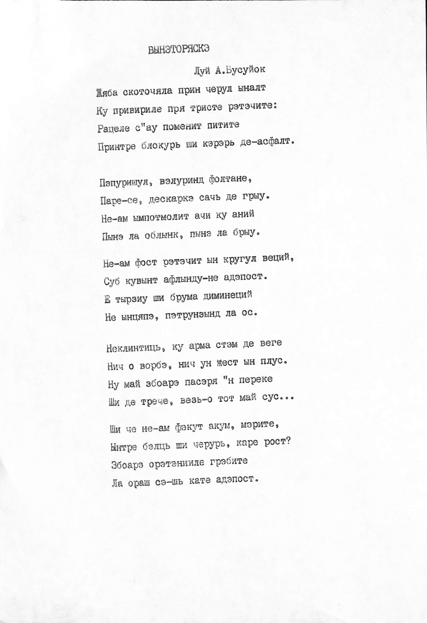 Boțu, Pavel. Manuscris dactilografiat. Poezia „Vânătorească” dedicată lui Aureliu Busuioc este inserată pe o pagină și cuprinde cinci strofe. Manuscrisul dactilografiat este scris în limba română cu caractere chirilice. Fără datare.
