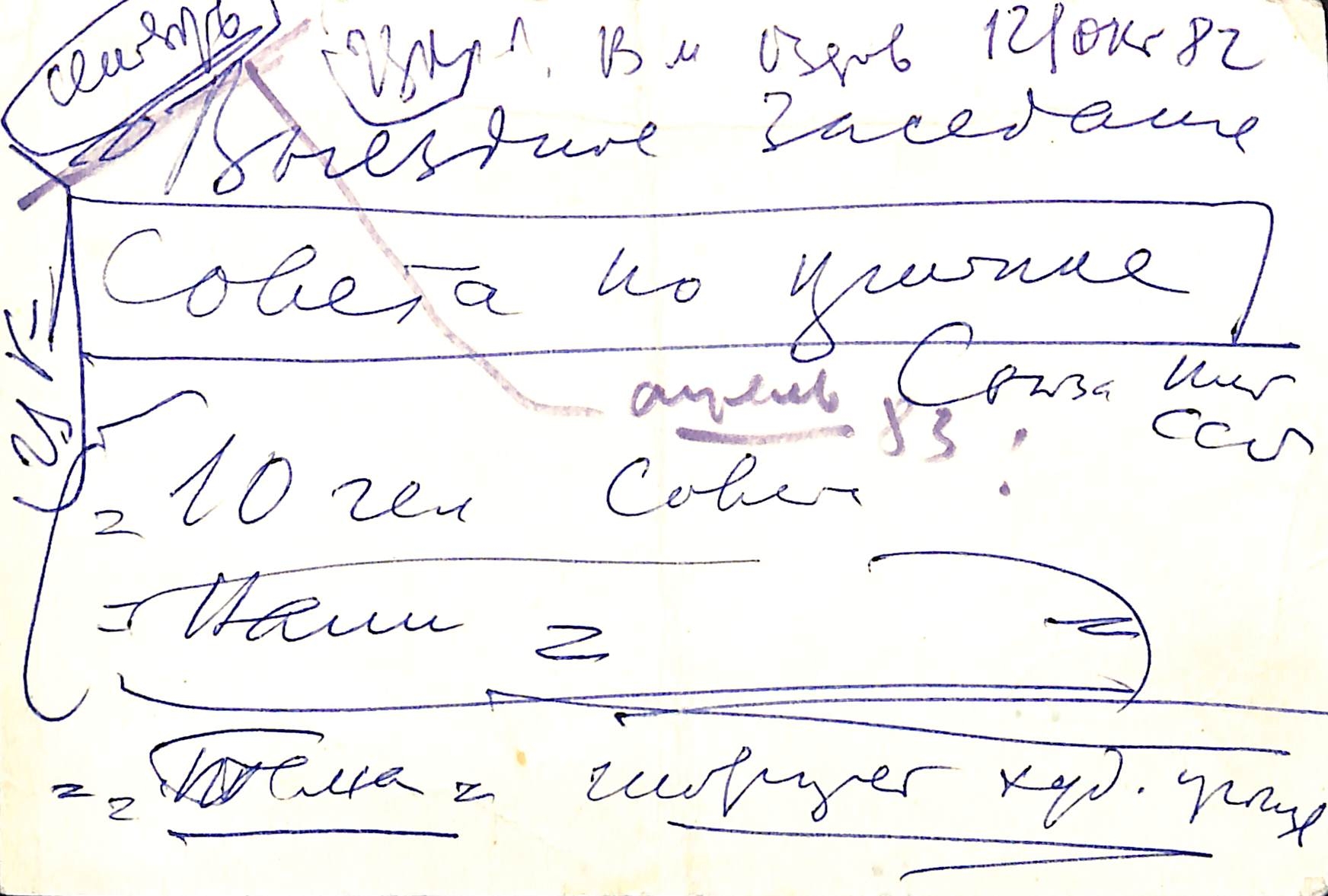 Boțu, Pavel. Manuscris olograf. Notițe, însemnări, numere de telefon: „...Выездное заседание...”. Manuscris scris olograf pe pagină de carnet scris în limba rusă cu stilou în culoare albastră. Este scrisă data: „ 12 oct. 82”.