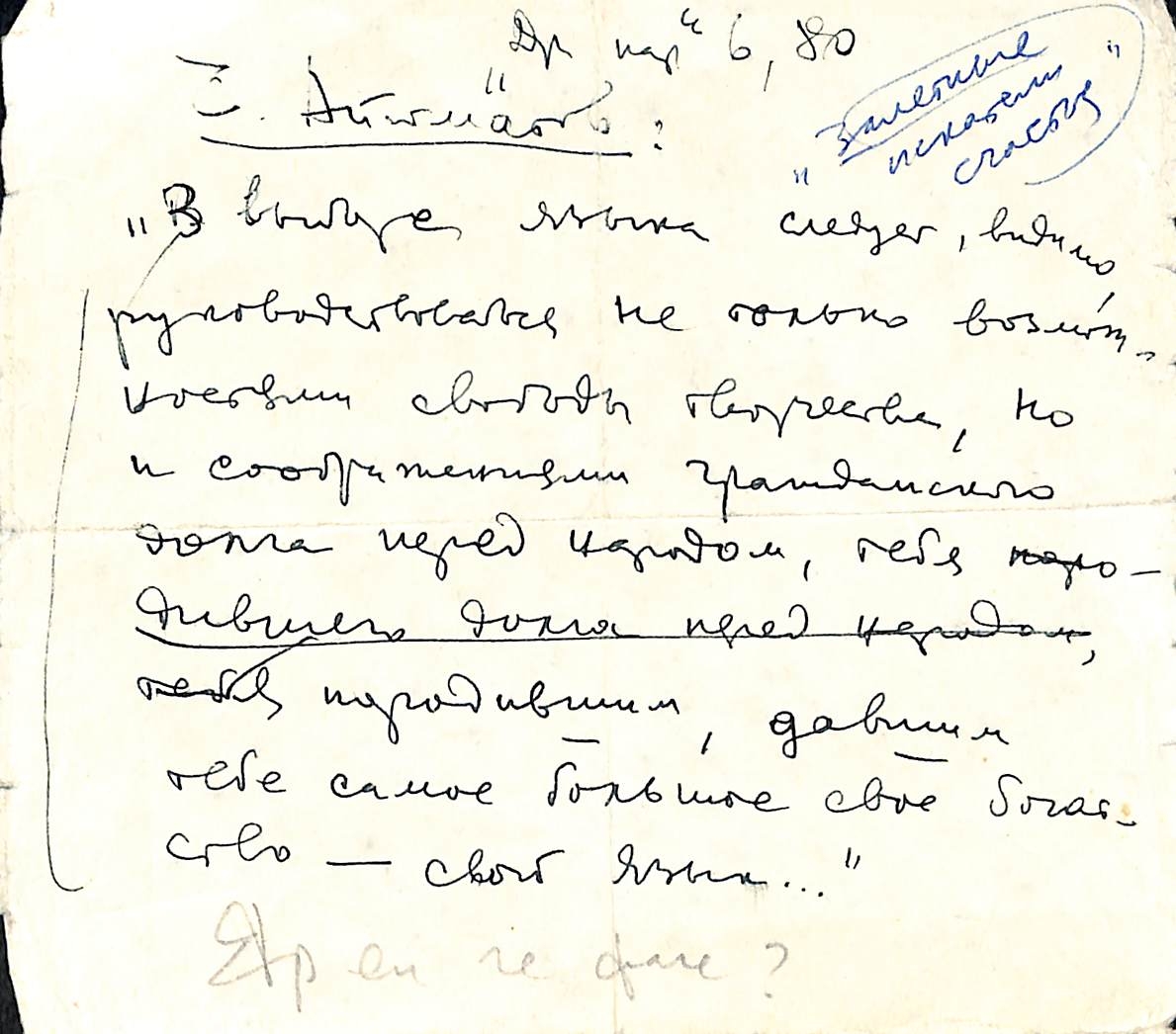 Boțu, Pavel. Manuscris olograf. Referință selectată de scriitorul Pavel Boțu din revista „Дружба Народов” nr.6, 1980. Чингис Айтматов: „...язык следует...”. Manuscrisul este inserat pe o pagină fragmentată. Manuscrisul olograf este scris în limba rusă cu stilou în culoare albastră și neagră, iar mai jos este scris în limba română cu caractere chirilice cu creion simplu în culoare neagră. Pe verso este scris olograf ilizibil cu stilou în culoare albastră.