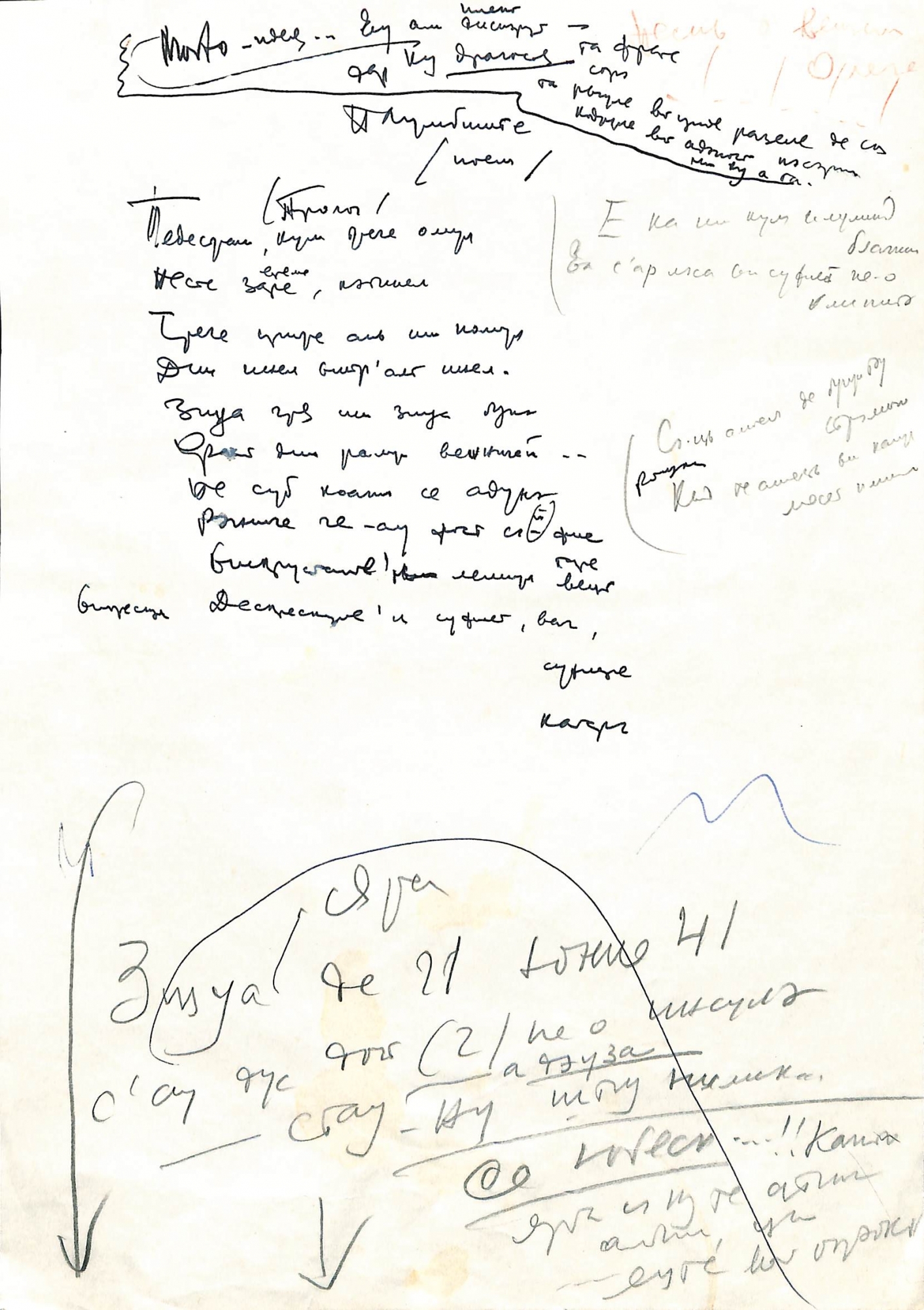 Boțu, Pavel. Manuscris olograf. Poezia „...Prolog...” cu titlul scris ilizibil este inserată pe o pagină. Manuscrisul olograf este scris în limba română cu caractere chirilice cu stilou în culoare neagră și completări cu creion în culoare roșie și neagră. Fără datare