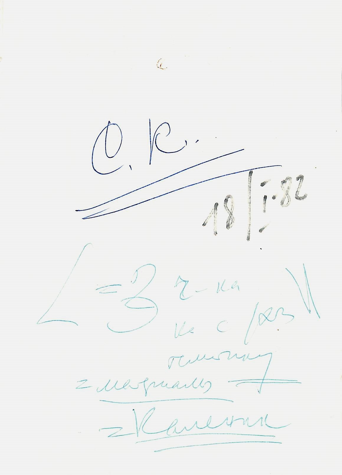 Boțu, Pavel. Manuscris olograf. Notițe, însemnări varia scrise olograf de Pavel Boțu, Deputat, Președinte al Uniunii Scriitorilor din Moldova. Manuscrisul olograf este inserat pe opt pagini de carnet, scris în limba rusă cu stilou în culorile albastru, roșu, verde. Pe prima pagină este scrisă data: „18/ I. 82”.