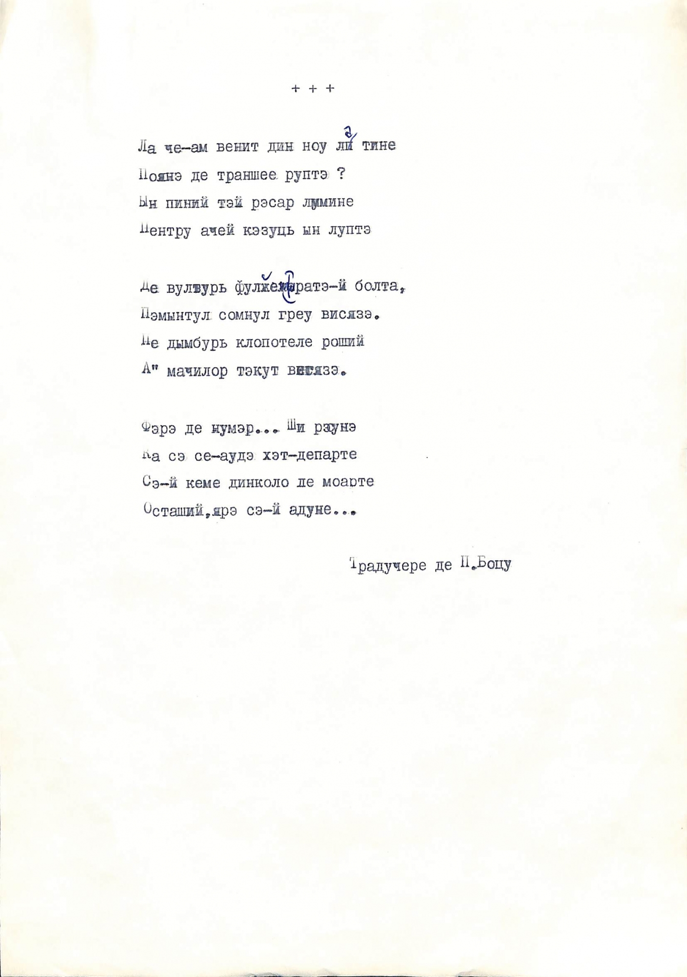 Boțu, Pavel. Manuscris dactilografiat. Poezia fără titlu cu început de vers: „ La ce-am venit din nou la tine...” de Maxim TANK este tradusă de scriitorul Pavel Boțu. Poezia cuprinde trei strofe și este dactilografiată în limba română cu caractere chirilice și corectări scrise olograf cu stilou în culoare albastră. În partea inferioară a manuscrisului după ultima strofă, mai jos este dactilografiat: „Traducere de P. BOȚU”. Fără datare.
