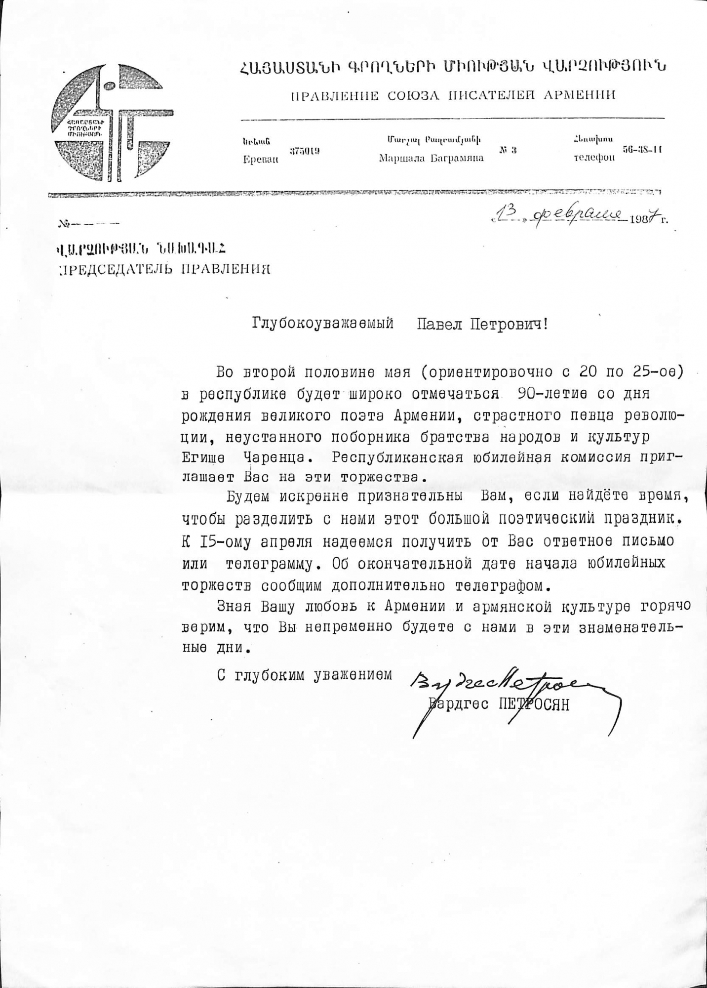 Boțu, Pavel. Manuscris dactilografiat. Scrisoare adresată lui Pavel Boțu de la Petrosean V., Președintele Uniunii Scriitorilor din Armenia. Scrisoarea este inserată pe un formular-tip cu antetul instituției din data de 13 februarie 1987. Scrisoarea conține informația cu privire la invitația lui Pavel Boțu la sărbătoarea prilejuită de 90 de ani de la nașterea scriitorului armean Eghișe Ciarența. Răvașul este dactilografiat în limba rusă și semnat olograf cu stilou în cerneală neagră de către Președintele Uniunii Scriitorilor din Armenia.