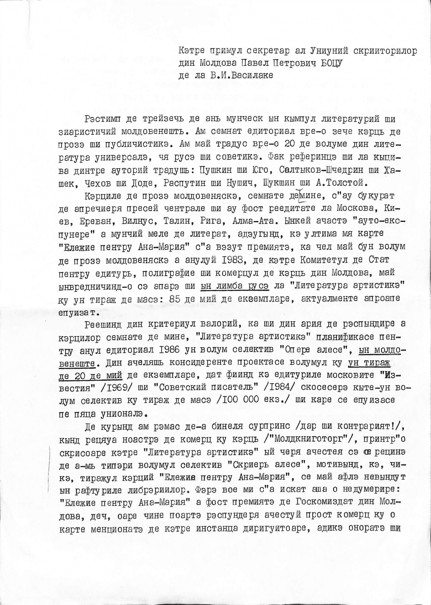 Boțu, Pavel. Manuscris dactilografiat. Scrisoare fără plic adresată lui Pavel Boțu, Prim-Secretar al Comitetului de Conducere al Uniunii Scriitorilor din Moldova de la scriitorul Vasile Vasilache cu privire la editare de carte. Scrisoarea este dactilografiată în limba română cu caractere chirilice și semnată olograf cu stilou în culoare albastră. La scrisoare este atașată o notiță pe care este scris: „...Comisia...”. Scrisoarea este datată cu: „12 august 1986”.